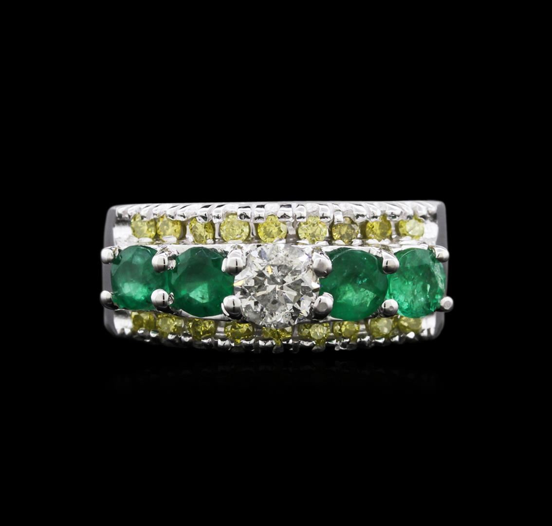 One electronically tested 14KT white gold ladies cast emerald and diamond ring with a bright polish finish. Identified with markings of "14K". Condition is new. Containing: Four prong set round modified brilliant cut natural emeralds, measuring 3.80 - 3.80 x 2.47 mm, approximate total weight of 0.98ct., clarity is heavily included, type III, medium light, very slightly grayish, green color, (GIA G 4/3), cut is good. One prong set round brilliant cut diamond, measuring 4.80 - 4.80 x 2.88mm (depth est.) approximate weight of 0.45ct. Clarity: I-2. Color: J, Cut is Good. Eighteen prong set round brilliant cut diamonds, measuring 1.80 - 1.80 x 1.08mm (depth est.) approximate total weight of 18 Stones = 0.35ct. Clarity: SI-2 to I-1, Cut is Good. Color of the stones has been treated. Colored gemstones are presumed to have been subjected to commonly used enhancement processes. All diamonds and colored gemstones are graded in the mounting, unless otherwise stated. Total Weight of Colored Stones 0.98ct. Total Weight of Diamonds 0.80 ct. Total Weight of Ring 7.60 grams. GGL Appraised.
