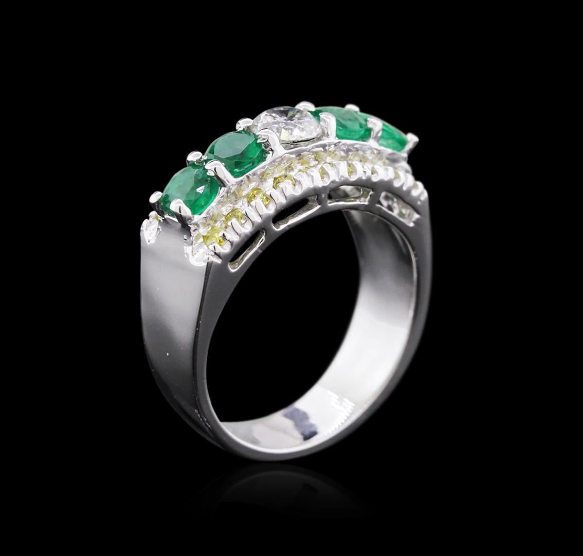 One electronically tested 14KT white gold ladies cast emerald and diamond ring with a bright polish finish. Identified with markings of "14K". Condition is new. Containing: Four prong set round modified brilliant cut natural emeralds, measuring 3.80 - 3.80 x 2.47 mm, approximate total weight of 0.98ct., clarity is heavily included, type III, medium light, very slightly grayish, green color, (GIA G 4/3), cut is good. One prong set round brilliant cut diamond, measuring 4.80 - 4.80 x 2.88mm (depth est.) approximate weight of 0.45ct. Clarity: I-2. Color: J, Cut is Good. Eighteen prong set round brilliant cut diamonds, measuring 1.80 - 1.80 x 1.08mm (depth est.) approximate total weight of 18 Stones = 0.35ct. Clarity: SI-2 to I-1, Cut is Good. Color of the stones has been treated. Colored gemstones are presumed to have been subjected to commonly used enhancement processes. All diamonds and colored gemstones are graded in the mounting, unless otherwise stated. Total Weight of Colored Stones 0.98ct. Total Weight of Diamonds 0.80 ct. Total Weight of Ring 7.60 grams. GGL Appraised.