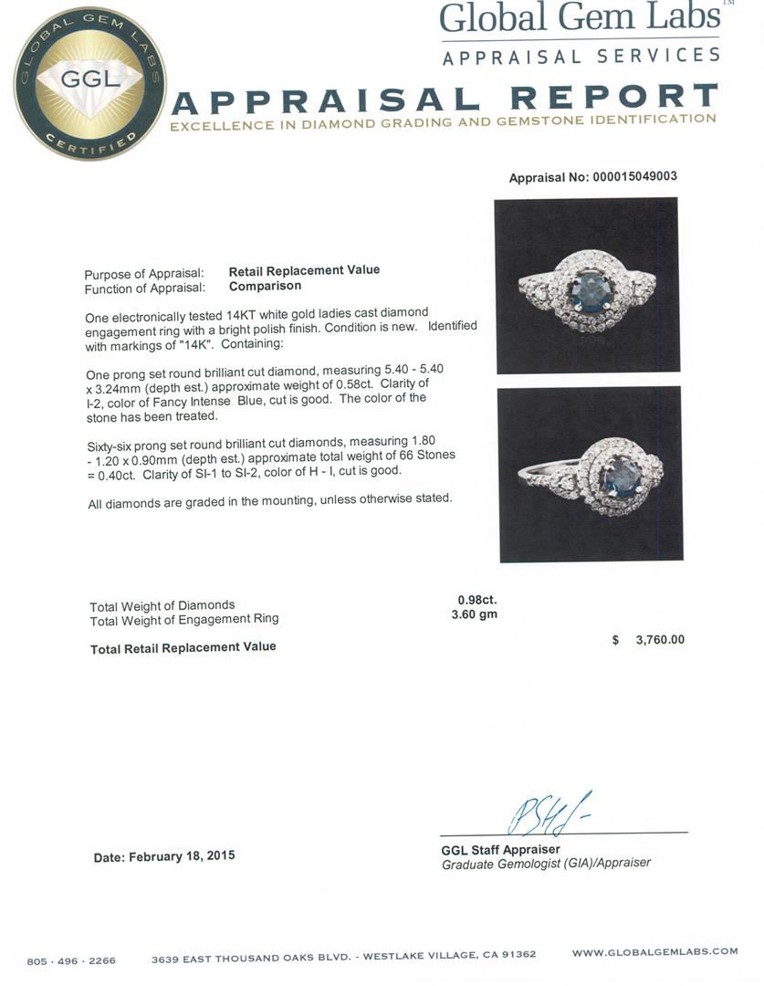 One electronically tested 14KT white gold ladies cast diamond engagement ring with a bright polish finish. Identified with markings of "14K". Condition is new. Containing: One prong set round brilliant cut diamond, measuring 5.40 - 5.40 x 3.24mm (depth est.) approximate weight of 0.58ct. Clarity: I-2, Cut is Good. The color of the stone has been treated. Sixty-Six prong set round brilliant cut diamonds, measuring 1.80 - 1.20 x 0.90mm (depth est.) approximate total weight of 66 Stones = 0.40ct. Clarity: SI-1 to SI-2. Color: H - I, Cut is Good. All diamonds are graded in the mounting, unless otherwise stated. Total Weight of Diamonds 0.98ct. Total Weight of Engagement Ring 3.60 grams. GGL Appraised at $3,760.00.