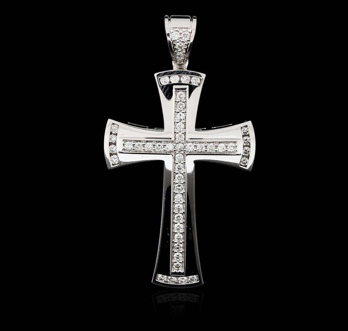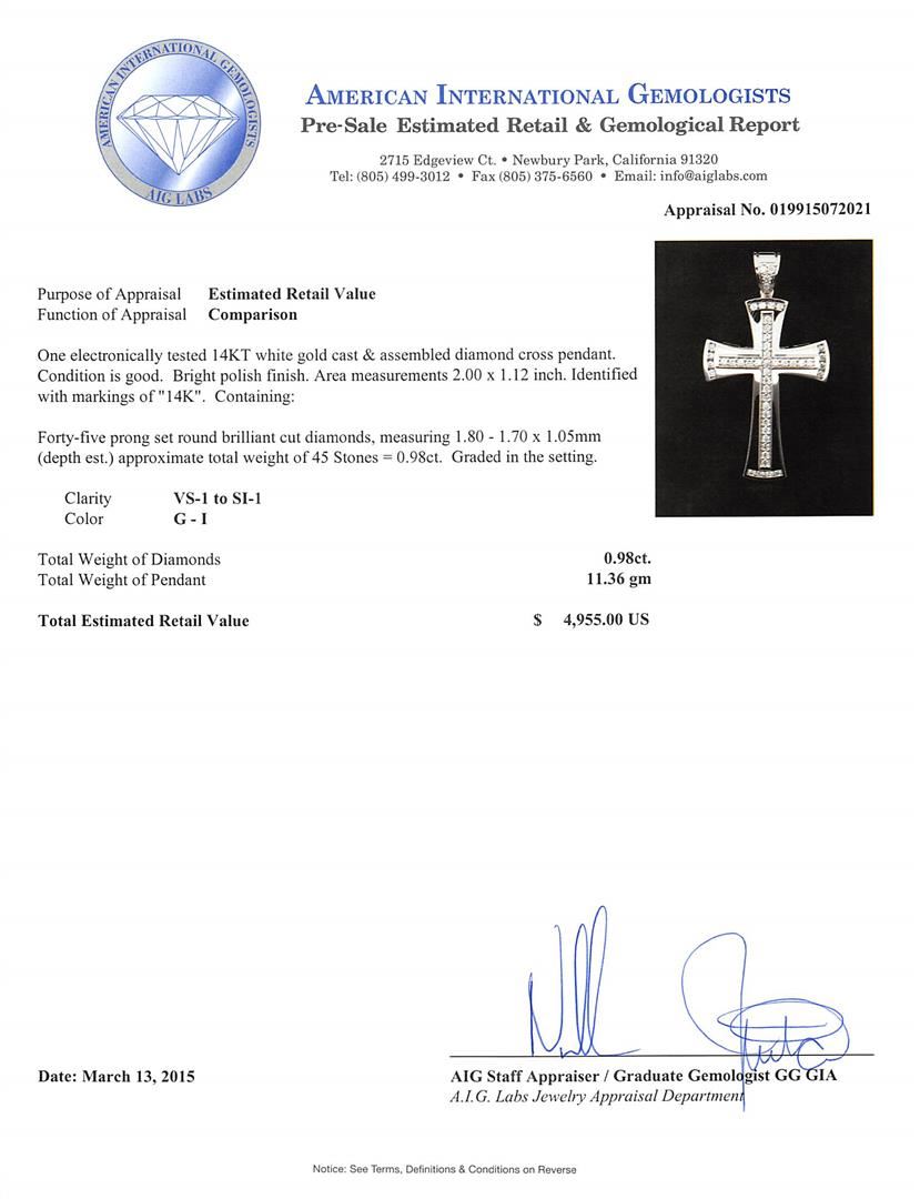 One electronically tested 14KT white gold cast & assembled diamond cross pendant. Bright polish finish. Area measurements 2.00 x 1.12 inch. Identified with markings of "14K". Condition is good. Containing: Forty-Five prong set round brilliant cut diamonds, measuring 1.80 - 1.70 x 1.05mm (depth est.) approximate total weight of 45 Stones = 0.98ct. Graded in the setting. Clarity: VS-1 to SI-1. Color: G - I. Total Weight of Diamonds 0.98ct. Total Weight of Pendant 11.36 grams. AIG Appraised at $4,955.00.