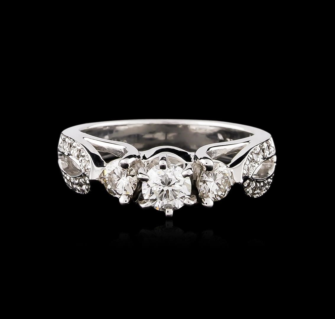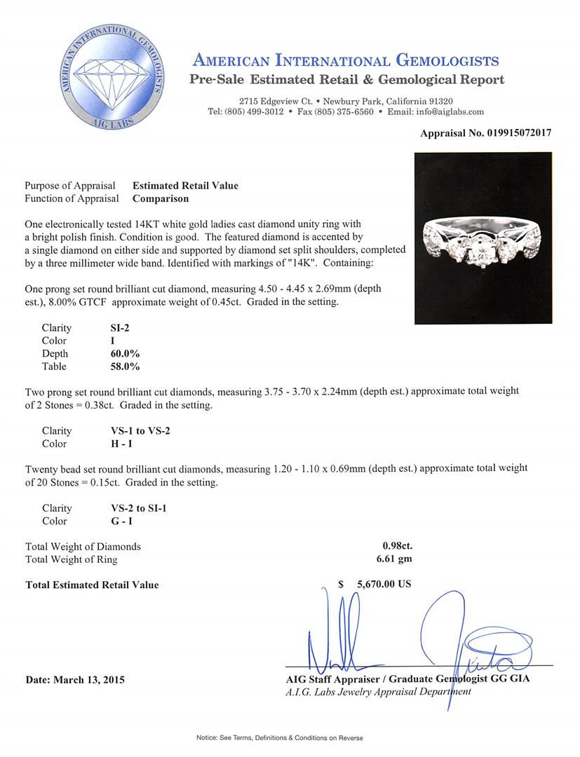One electronically tested 14KT white gold ladies cast diamond unity ring with a bright polish finish. The featured diamond is accented by a single diamond on either side and supported by diamond set split shoulders, completed by a three millimeter wide band. Identified with markings of "14K". Condition is good. Containing: One prong set round brilliant cut diamond, measuring 4.50 - 4.45 x 2.69mm (depth est.), 8.00.%. GTCF approximate weight of 0.45ct. Graded in the setting. Clarity: SI-2. Color: I. Depth 60.0%. Table 58.0%. Two prong set round brilliant cut diamonds, measuring 3.75 - 3.70 x 2.24mm (depth est.) approximate total weight of 2 Stones = 0.38ct. Graded in the setting. Clarity: VS-1 to VS-2. Color: H - I Twenty bead set round brilliant cut diamonds, measuring 1.20 - 1.10 x 0.69mm (depth est.) approximate total weight of 20 Stones = 0.15ct. Graded in the setting. Clarity: VS-2 to SI-1. Color: G - I. Total Weight of Diamonds 0.98ct. Total Weight of Ring 6.61 grams. AIG Appraised at $5,670.00.