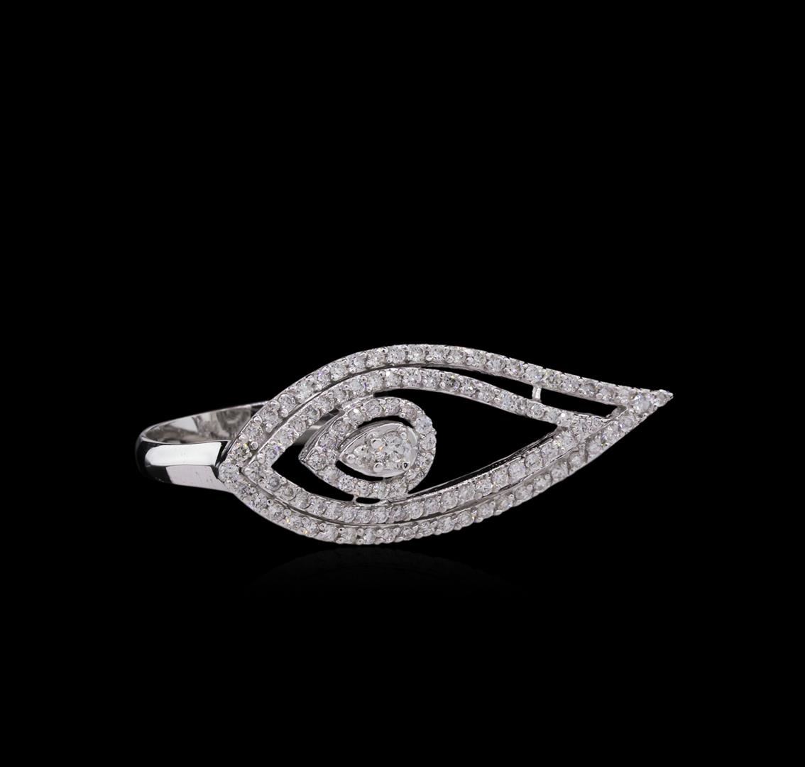 One electronically tested 14KT white gold ladies cast diamond ring with a bright polish finish. Identified with markings of "K14". Condition is new. Containing: One prong set round brilliant cut diamond, measuring 2.80 - 2.80 x 1.68mm (depth est.) approximate weight of 0.08ct. Clarity: I-1. Color: I, Cut is Good. One Hundred Twelve prong set round brilliant cut diamonds, measuring 1.50 - 1.10 x 0.78mm (depth est.) approximate total weight of 112 Stones = 0.90ct. Clarity: I-1 to I-2. Color: I - J, Cut is Good. All diamonds are graded in the mounting, unless otherwise stated. Total Weight of Diamonds 0.98ct. Total Weight of Ring 5.80 grams. GGL Appraised at $4,850.00.