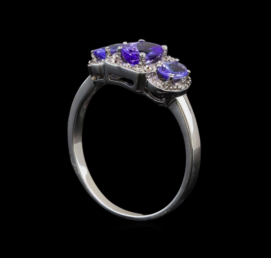 One electronically tested 14KT white gold ladies cast tanzanite and diamond ring with a bright polish finish. Identified with markings of "14K". Condition is new. Containing: One prong set oval modified brilliant cut natural tanzanite, measuring 6.40 x 4.50 x 2.93mm, approximate weight of 0.59ct., clarity is eye clean, type I, medium light, slightly grayish, violet color, (GIA V 4/2), cut is good. Two prong set oval modified brilliant cut natural tanzanites, measuring 4.90 x 3.00 x 1.95mm, approximate total weight of 0.40ct., clarity is eye clean, type I, medium light, slightly grayish, violet color, (GIA V 4/2), cut is good. Sixteen prong set round brilliant cut diamonds, measuring 1.30 - 1.30 x 0.78mm (depth est.) approximate total weight of 16 Stones = 0.13ct. Clarity: I-1 to I-2. Color: I - J. Colored gemstones are presumed to have been subjected to commonly used enhancement processes. Colored gemstones are presumed to have been subjected to commonly used enhancement processes. All diamonds and colored gemstones are graded in the mounting, unless otherwise stated. All diamonds and colored gemstones are graded in the mounting, unless otherwise stated. Total Weight of Colored Stones 0.99ct. Total Weight of Diamonds 0.13ct. Total Weight of Ring 3.30 grams. GGL Appraised at $1,670.00.