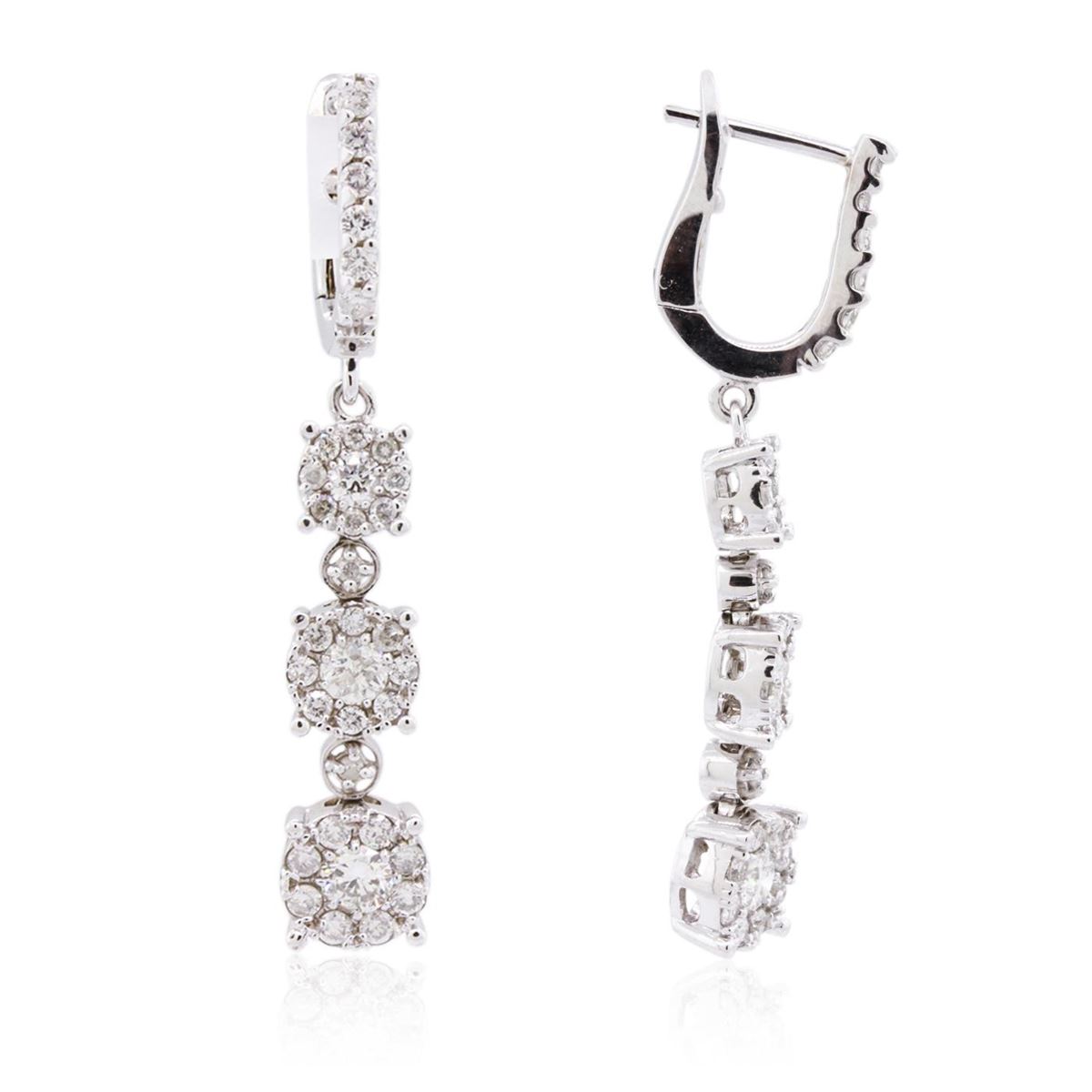 One pair electronically tested 14KT white gold ladies combination cast & assembled diamond dangle earrings with hinged clip backs with a bright polish finish. Condition is new. Containing: Sixty prong set round brilliant cut diamonds, measuring 1.50 - 1.30 x 0.84mm (depth est.) approximate total weight of 60 Stones = 0.60ct. . Clarity: SI-2 to I-1. Color: I - J, Cut is Good. Six prong set round brilliant cut diamonds, measuring 3.00 - 2.20 x 1.56mm (depth est.) approximate total weight of 6 Stones = 0.39ct. . Clarity: SI-1 to SI-2. Color: I - J, Cut is Good. All diamonds are graded in the mounting, unless otherwise stated. Total Weight of Diamonds 0.99ct. Total Weight of Dangle Earrings 5.90 grams. GGL Appraised at $4,340.00.