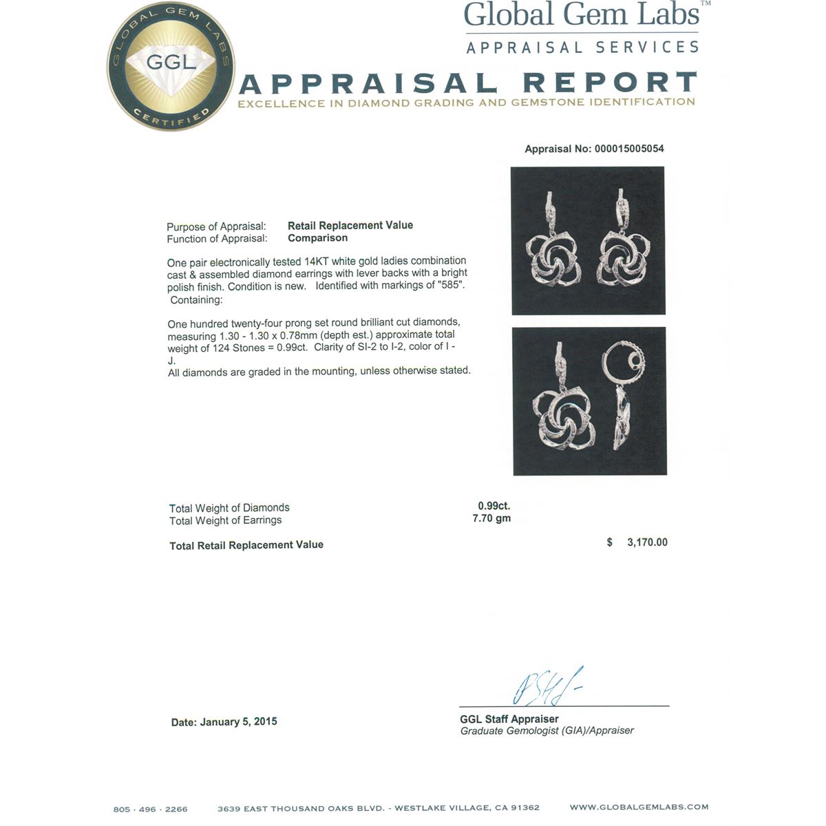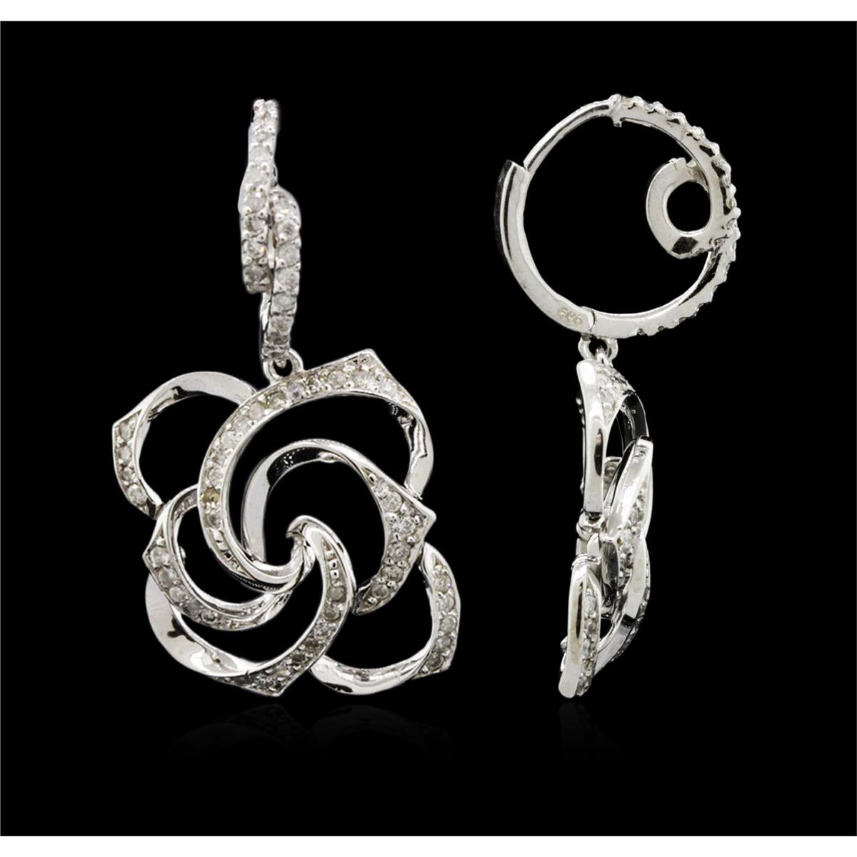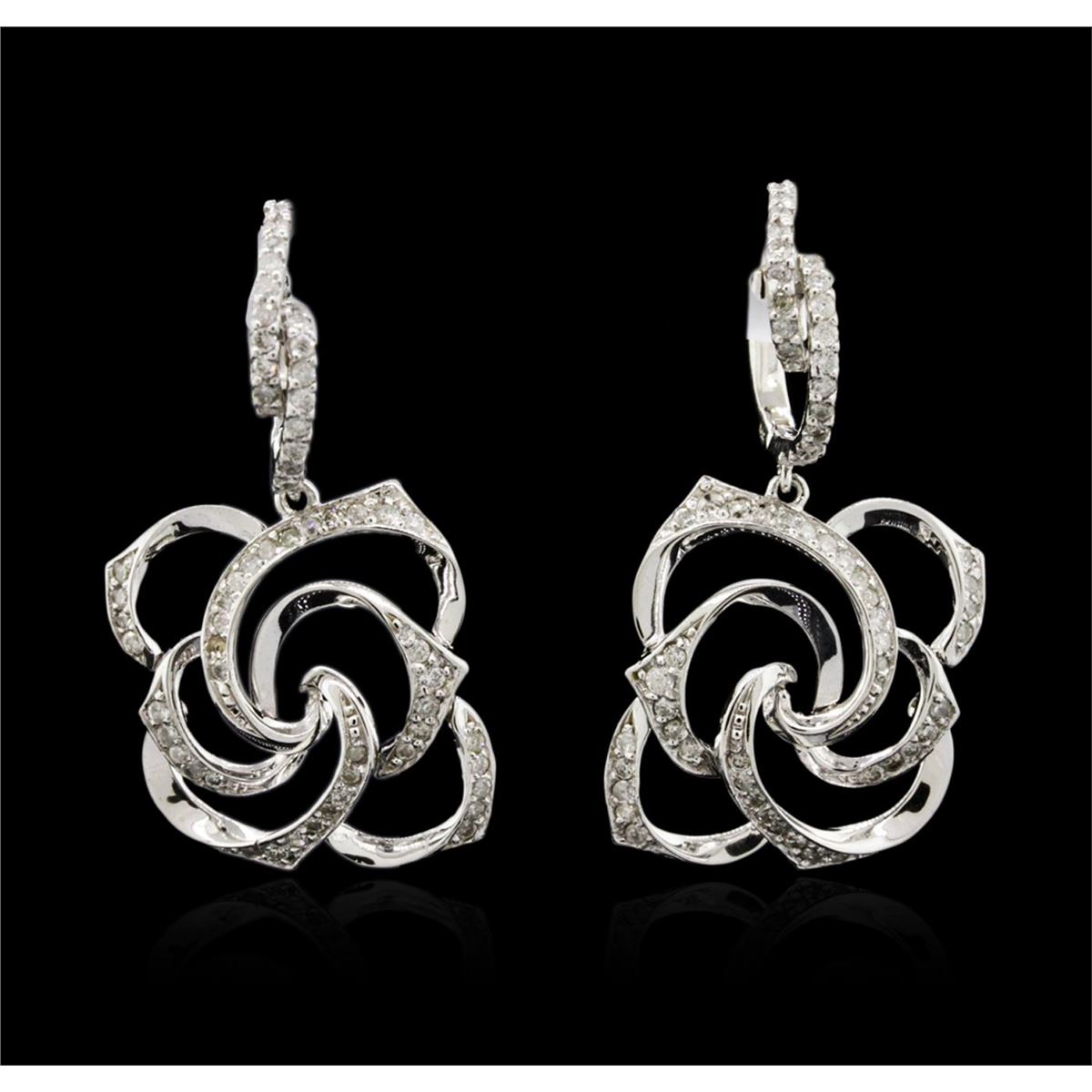One pair electronically tested 14KT white gold ladies combination cast & assembled diamond earrings with lever backs with a bright polish finish. Identified with markings of "585". Condition is new. Containing: One Hundred Twenty-Four prong set round brilliant cut diamonds, measuring 1.30 - 1.30 x 0.78mm (depth est.) approximate total weight of 124 Stones = 0.99ct. Clarity: SI-2 to I-2. Color: I - J. All diamonds are graded in the mounting, unless otherwise stated. Total Weight of Diamonds 0.99ct. Total Weight of Earrings 7.70 grams. GGL Appraised at $3,170.00.