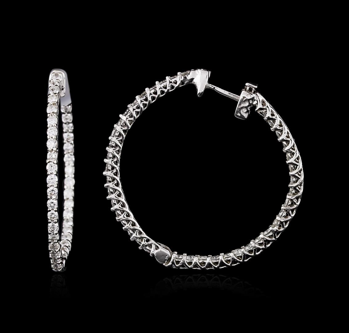 One pair electronically tested 14KT white gold ladies combination cast & assembled hoop earrings with hinged clip backs with a bright polish finish. Condition is new. Containing: Eighty prong set round brilliant cut diamonds, measuring 1.50 - 1.50 x 0.90mm (depth est.) approximate total weight of 80 Stones = 0.99ct. Clarity: SI-2 to I-1. Color: I - J, Cut is Good. All diamonds are graded in the mounting, unless otherwise stated. Total Weight of Diamonds 0.99ct. Total Weight of Earrings 7.00 grams. GGL Appraised at $4,930.00.