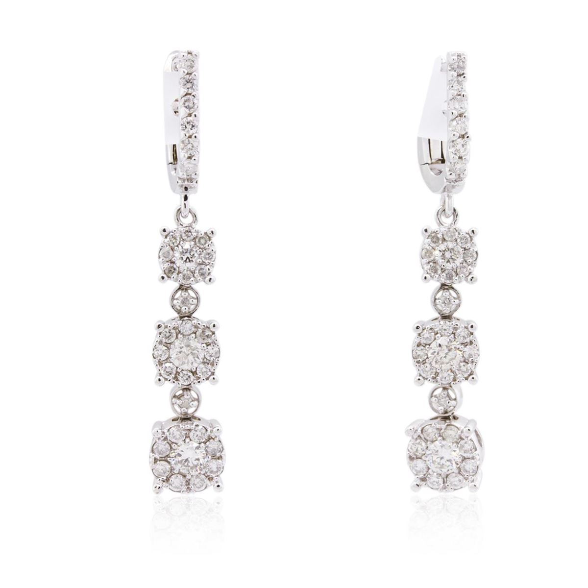 One pair electronically tested 14KT white gold ladies combination cast & assembled diamond dangle earrings with hinged clip backs with a bright polish finish. Condition is new. Containing: Sixty prong set round brilliant cut diamonds, measuring 1.50 - 1.30 x 0.84mm (depth est.) approximate total weight of 60 Stones = 0.60ct. . Clarity: SI-2 to I-1. Color: I - J, Cut is Good. Six prong set round brilliant cut diamonds, measuring 3.00 - 2.20 x 1.56mm (depth est.) approximate total weight of 6 Stones = 0.39ct. . Clarity: SI-1 to SI-2. Color: I - J, Cut is Good. All diamonds are graded in the mounting, unless otherwise stated. Total Weight of Diamonds 0.99ct. Total Weight of Dangle Earrings 5.90 grams. GGL Appraised at $4,340.00.