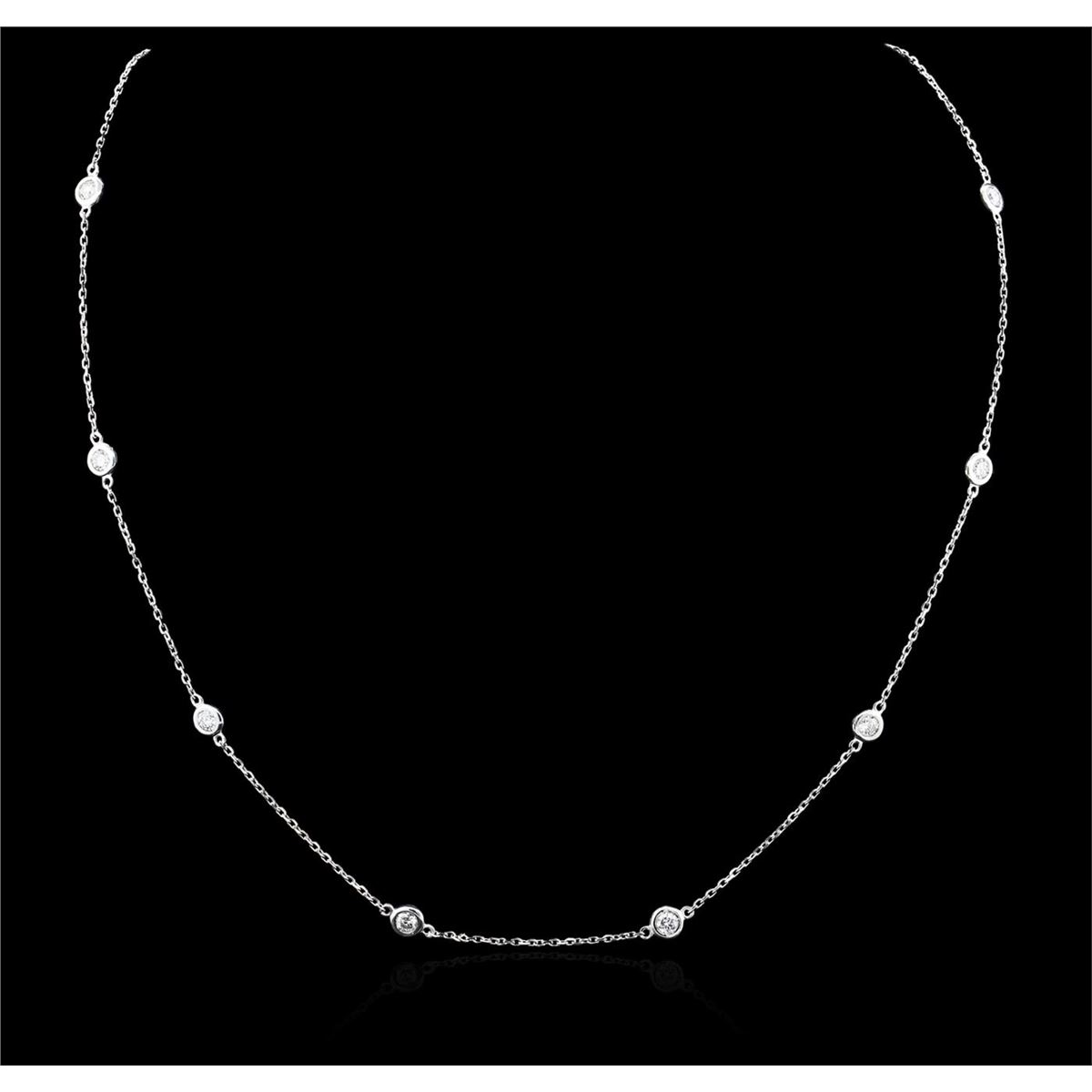 One electronically tested 14KT white gold ladies cast diamond necklace with a lobster claw clasp with a bright polish finish. Measurements: 18" in length Identified with markings of "K14". Condition is new. Containing: Ten bezel set round brilliant cut diamonds, measuring 3.00 - 3.00 x 1.80mm (depth est.) approximate total weight of 10 Stones = 0.99ct. Clarity: SI-2 to I-1. Color: I - J, Cut is Good. All diamonds are graded in the mounting, unless otherwise stated. Total Weight of Diamonds 0.99ct. Total Weight of Necklace 4.00 grams. GGL Appraised at $3,175.00.