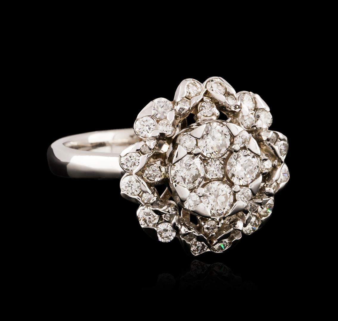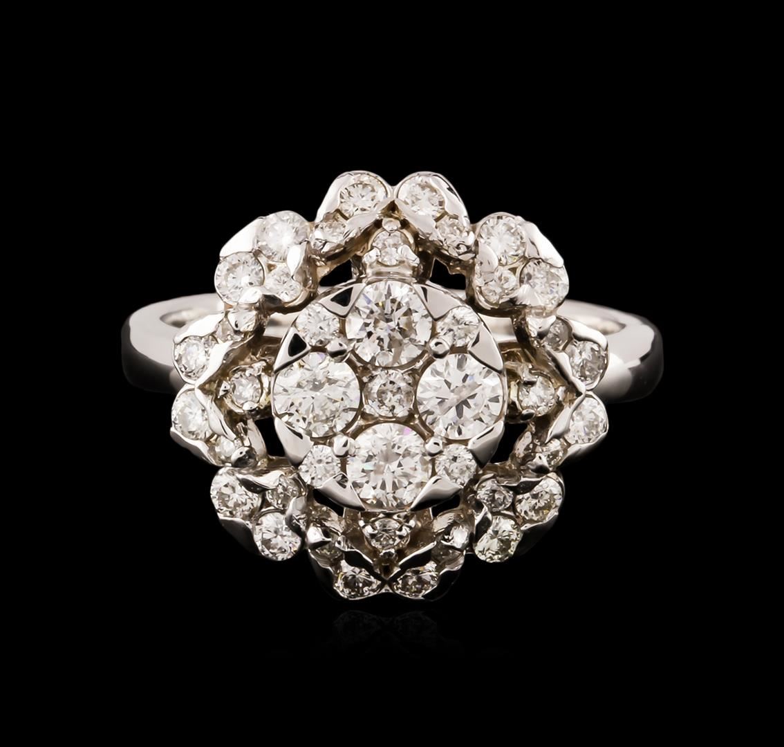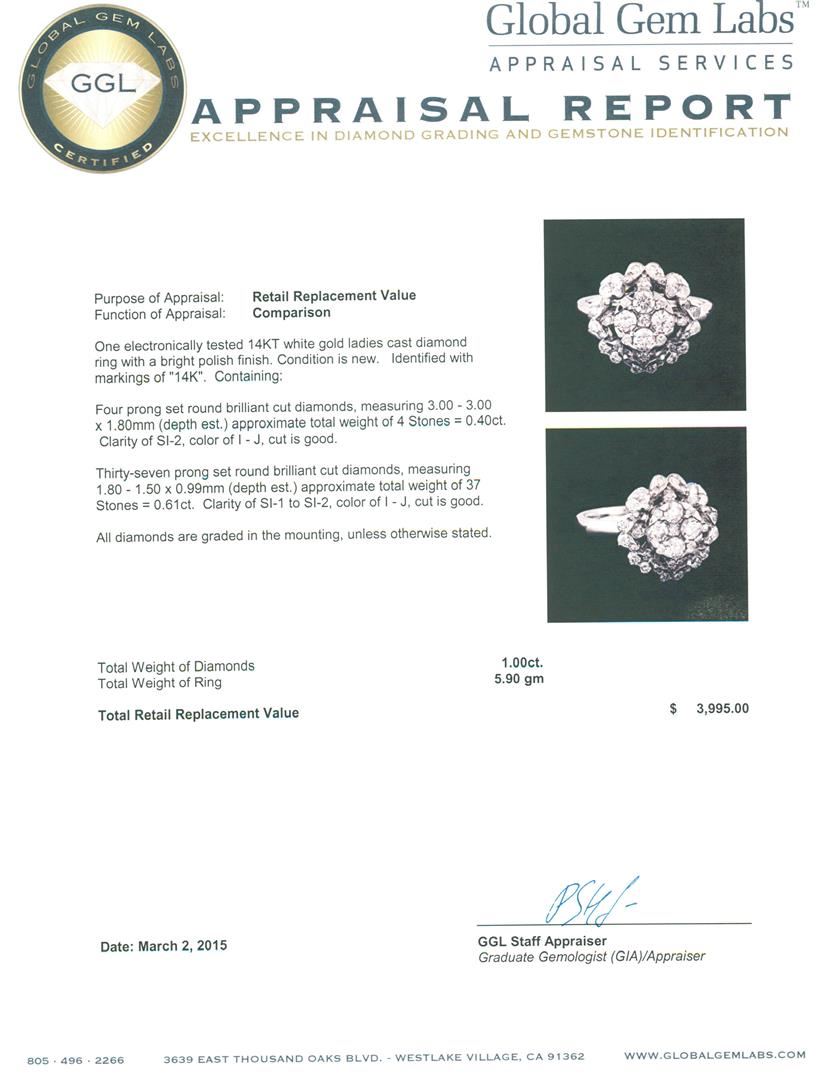 One electronically tested 14KT white gold ladies cast diamond ring with a bright polish finish. Identified with markings of "14K". Condition is new. Containing: Four prong set round brilliant cut diamonds, measuring 3.00 - 3.00 x 1.80mm (depth est.) approximate total weight of 4 Stones = 0.40ct. Clarity: SI-2. Color: I - J, Cut is Good. Thirty-Seven prong set round brilliant cut diamonds, measuring 1.80 - 1.50 x 0.99mm (depth est.) approximate total weight of 37 Stones = 0.61ct. Clarity: SI-1 to SI-2. Color: I - J, Cut is Good. All diamonds are graded in the mounting, unless otherwise stated. Total Weight of Diamonds 1.00ct. Total Weight of Ring 5.90 grams. GGL Appraised at $3,995.00.