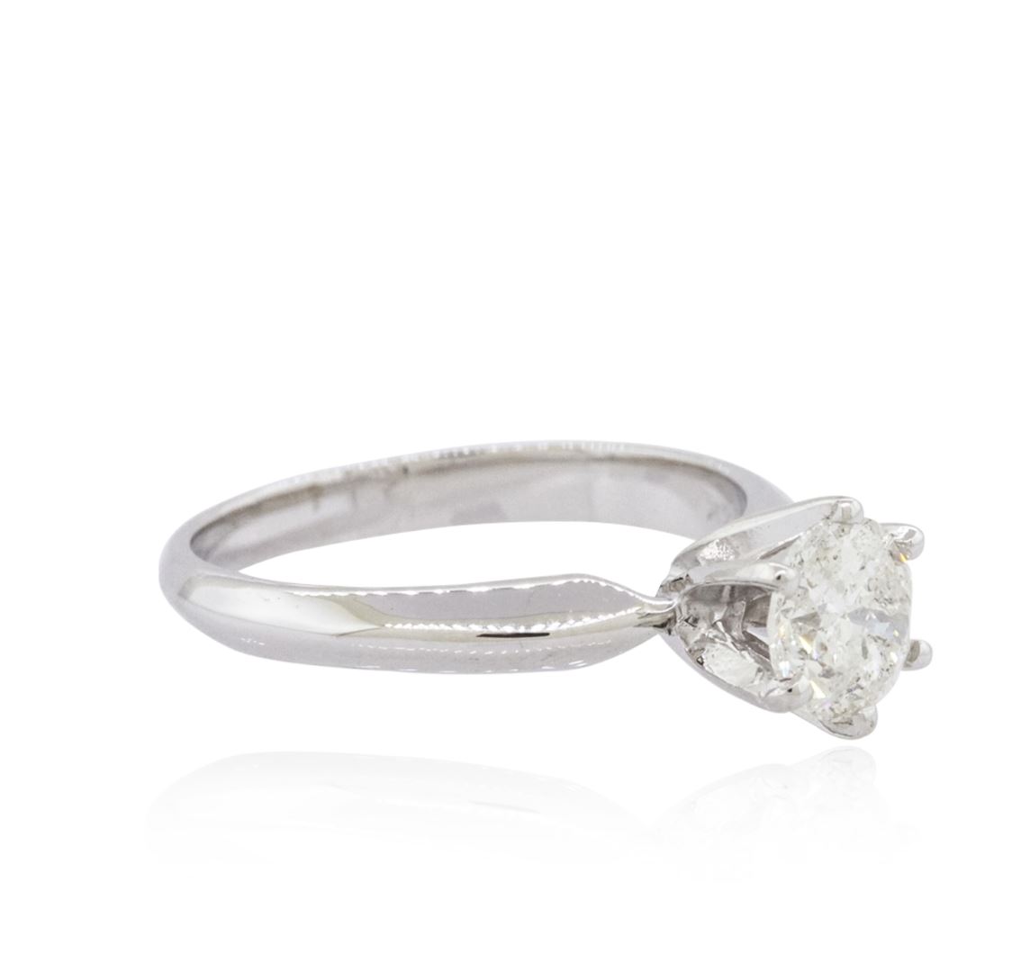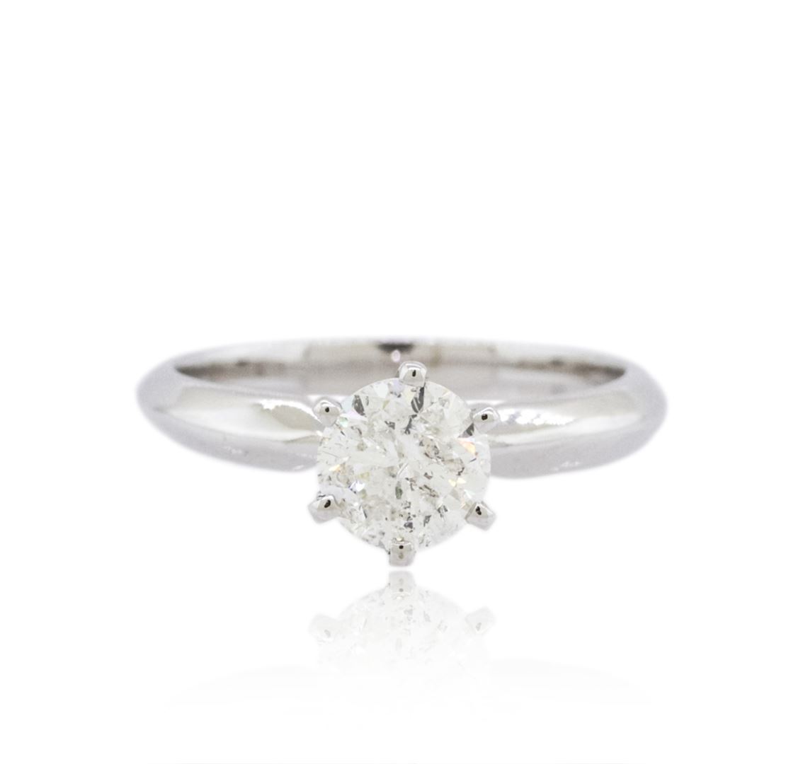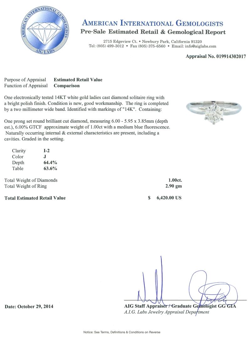 One electronically tested 14KT white gold ladies cast diamond solitaire ring with a bright polish finish. The ring is completed by a two millimeter wide band. Identified with markings of "14K". Condition is new, good workmanship. Containing: One prong set round brilliant cut diamond, measuring 6.00 - 5.95 x 3.85mm (depth est.), 6.00.%. GTCF approximate weight of 1.00ct with a medium blue fluorescence. Naturally occurring internal & external characteristics are present, including a cavities. Graded in the setting. Clarity: I-2. Color: 64.4%. Table 63.6%. Total Weight of Diamonds 1.00ct. Total Weight of Ring 2.90 grams. AIG Appraised at $6,420.00.