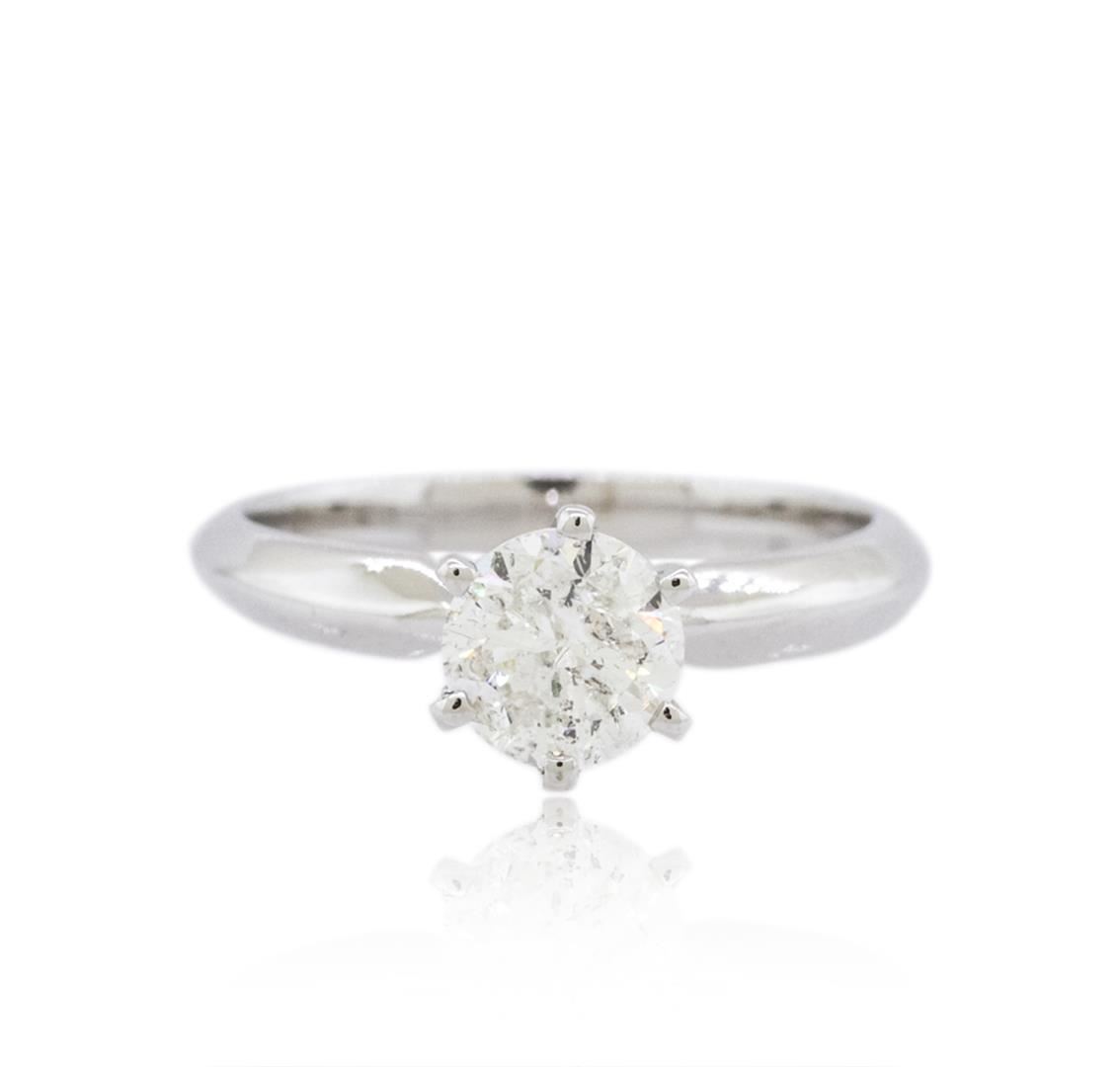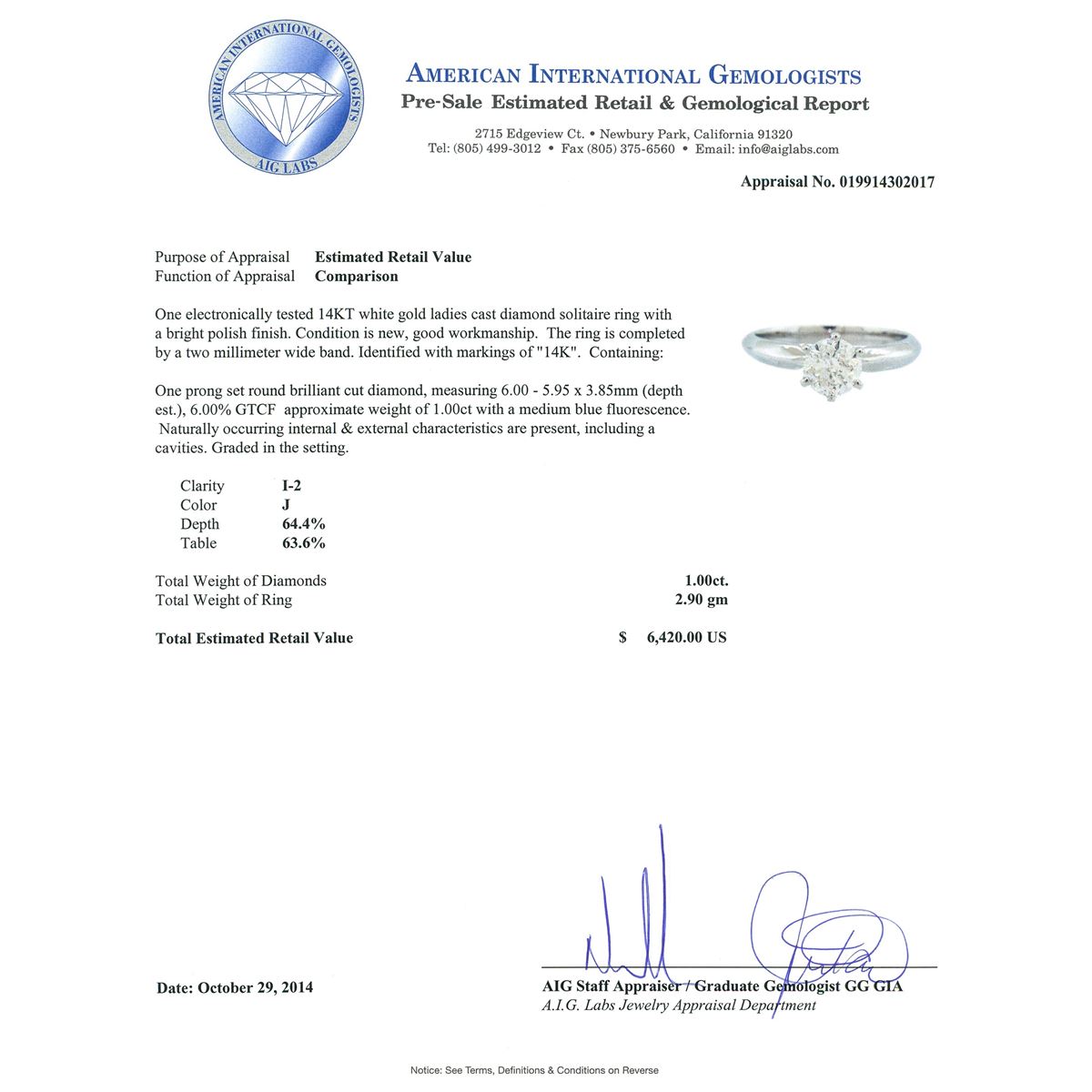 One electronically tested 14KT white gold ladies cast diamond solitaire ring with a bright polish finish. The ring is completed by a two millimeter wide band. Identified with markings of "14K". Condition is new, good workmanship. Containing: One prong set round brilliant cut diamond, measuring 6.00 - 5.95 x 3.85mm (depth est.), 6.00.%. GTCF approximate weight of 1.00ct with a medium blue fluorescence. Naturally occurring internal & external characteristics are present, including a cavities. Graded in the setting. Clarity: I-2. Color: 64.4%. Table 63.6%. Total Weight of Diamonds 1.00ct. Total Weight of Ring 2.90 grams. AIG Appraised at $6,420.00.