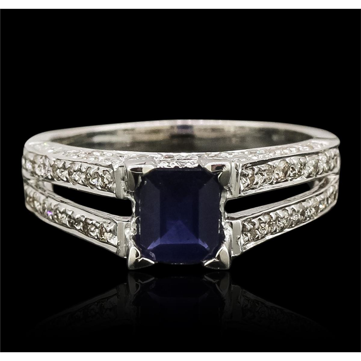 One electronically tested 14KT white gold ladies cast sapphire and diamond ring with a bright polish finish. The featured sapphire is supported by a diamond set under gallery and diamond set split shoulders, completed by a two millimeter wide band. Identified with markings of "14K". Condition is new, good workmanship. Containing: One prong set rectangular step cut natural blue sapphire, measuring 5.85 x 4.95 x 2.65mm, 8%. bulge factor, approximate weight of 1.00ct., clarity is moderately included, type II, medium dark, very slightly grayish, violetish blue color, (GIA vB 6/3), cut is good. Transmitting light with a minimum of distortion, transparent to translucent. Naturally occurring internal & external characteristics are present, including some partial color zoning. Graded in the setting. Seventy-Four prong set round brilliant cut diamonds, measuring 1.40 - 1.30 x 0.81mm (depth est.) approximate. Total Weight of 74 Stones = 0.76ct. Graded in the setting. Clarity: SI-1 to I-1. Color: H - J. Total Weight of Colored Stones 1.00ct. Total Weight of Diamonds 0.76ct. Total Weight of Ring 3.98gm. AIG Appraised at $3,615.00.