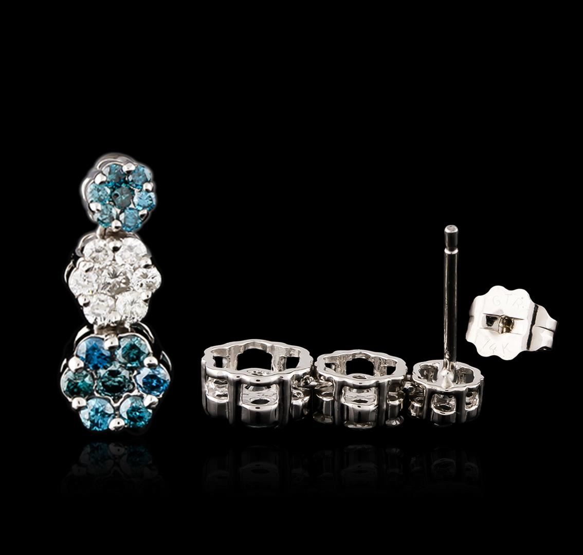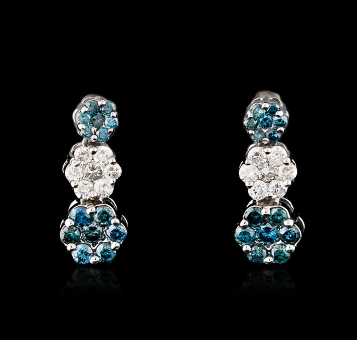 One pair of earrings featuring: 14KT white gold weighing 2.26 grams containing blue diamonds with a total weight of 0.70ct and white diamonds with a total weight of 0.30ct.
