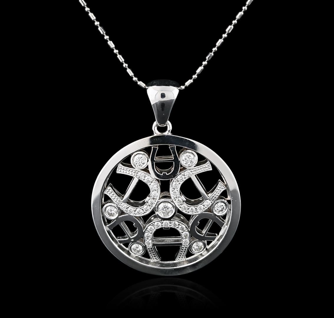 One electronically tested 14KT white gold ladies cast diamond pendant & chain 18.0" long, with a spring ring clasp with a bright polish finish. Identified with markings of "14K". Condition is new. Containing: One prong set round brilliant cut diamond, measuring 3.50 - 3.50 x 2.10mm (depth est.) approximate total weight of 0.16ct. Clarity: I-1. Color: H, Cut is Good. Six bezel set round brilliant cut diamonds, measuring 2.50 - 2.50 x 1.50mm (depth est.) approximate total weight of 6 Stones = 0.34ct. Clarity: SI-1 to I-1. Color: H - I, Cut is Good. Twenty-Seven prong set round brilliant cut diamonds, measuring 1.50 - 1.50 x 0.90mm (depth est.) approximate total weight of 27 Stones = 0.50ct. Clarity: SI-1 to I-1. Color: H - I, Cut is Good. All diamonds are graded in the mounting, unless otherwise stated. Total Weight of Diamonds 1.00ct. Total Weight of Pendant & Chain 13.46 grams. GGL Appraised at $4,205.00.