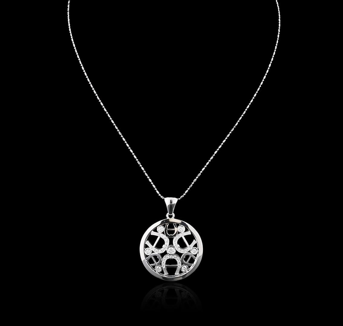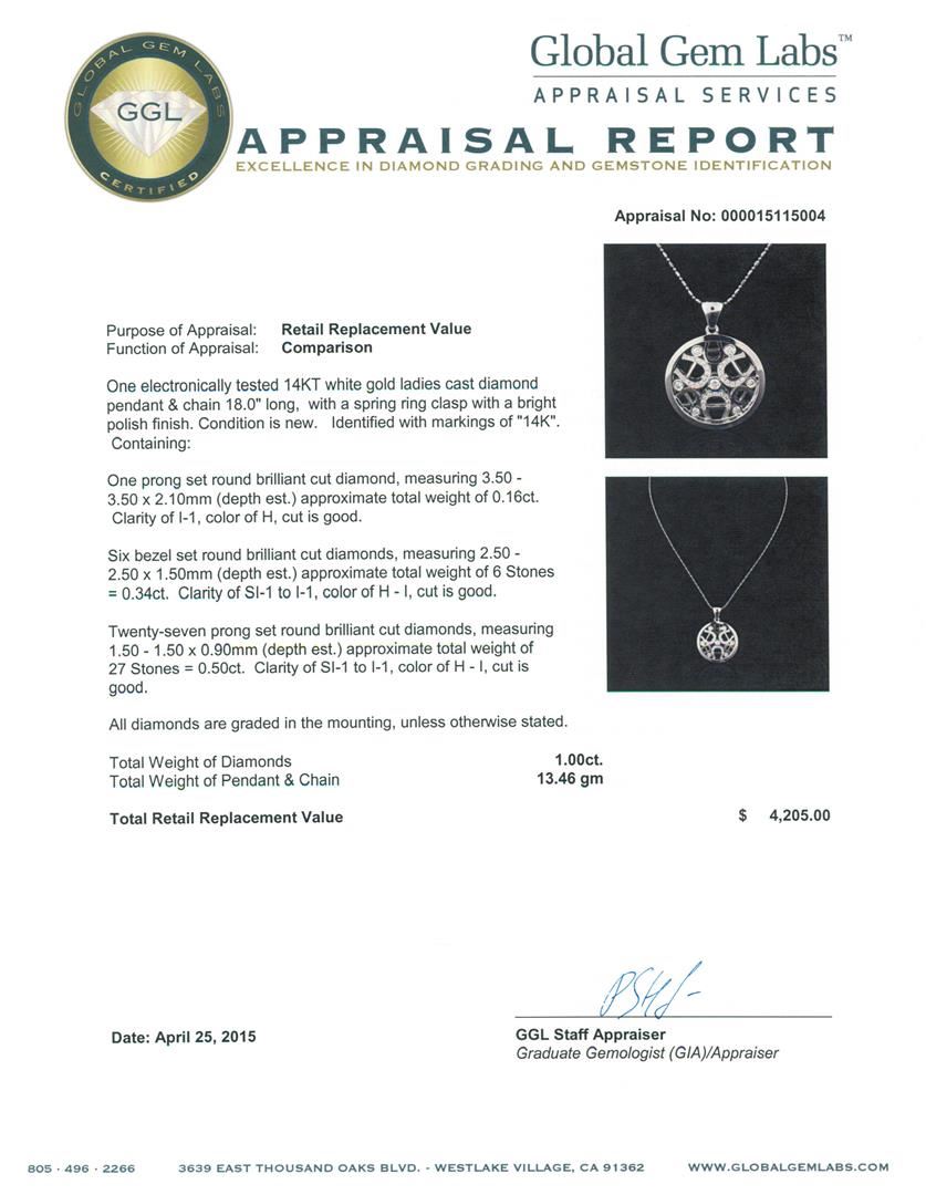 One electronically tested 14KT white gold ladies cast diamond pendant & chain 18.0" long, with a spring ring clasp with a bright polish finish. Identified with markings of "14K". Condition is new. Containing: One prong set round brilliant cut diamond, measuring 3.50 - 3.50 x 2.10mm (depth est.) approximate total weight of 0.16ct. Clarity: I-1. Color: H, Cut is Good. Six bezel set round brilliant cut diamonds, measuring 2.50 - 2.50 x 1.50mm (depth est.) approximate total weight of 6 Stones = 0.34ct. Clarity: SI-1 to I-1. Color: H - I, Cut is Good. Twenty-Seven prong set round brilliant cut diamonds, measuring 1.50 - 1.50 x 0.90mm (depth est.) approximate total weight of 27 Stones = 0.50ct. Clarity: SI-1 to I-1. Color: H - I, Cut is Good. All diamonds are graded in the mounting, unless otherwise stated. Total Weight of Diamonds 1.00ct. Total Weight of Pendant & Chain 13.46 grams. GGL Appraised at $4,205.00.