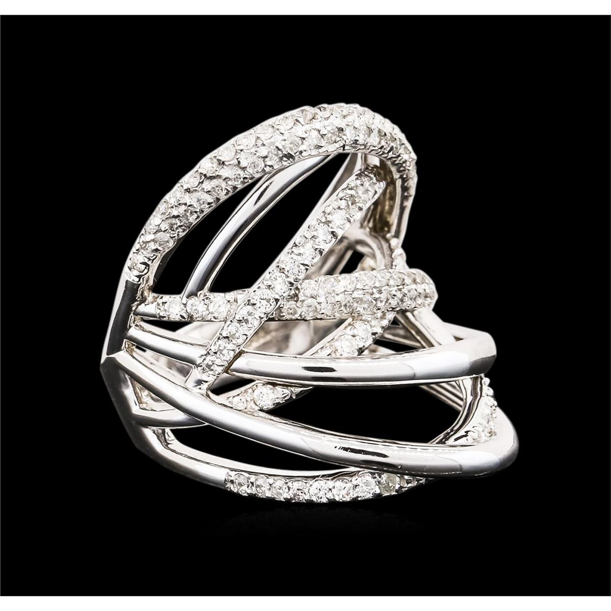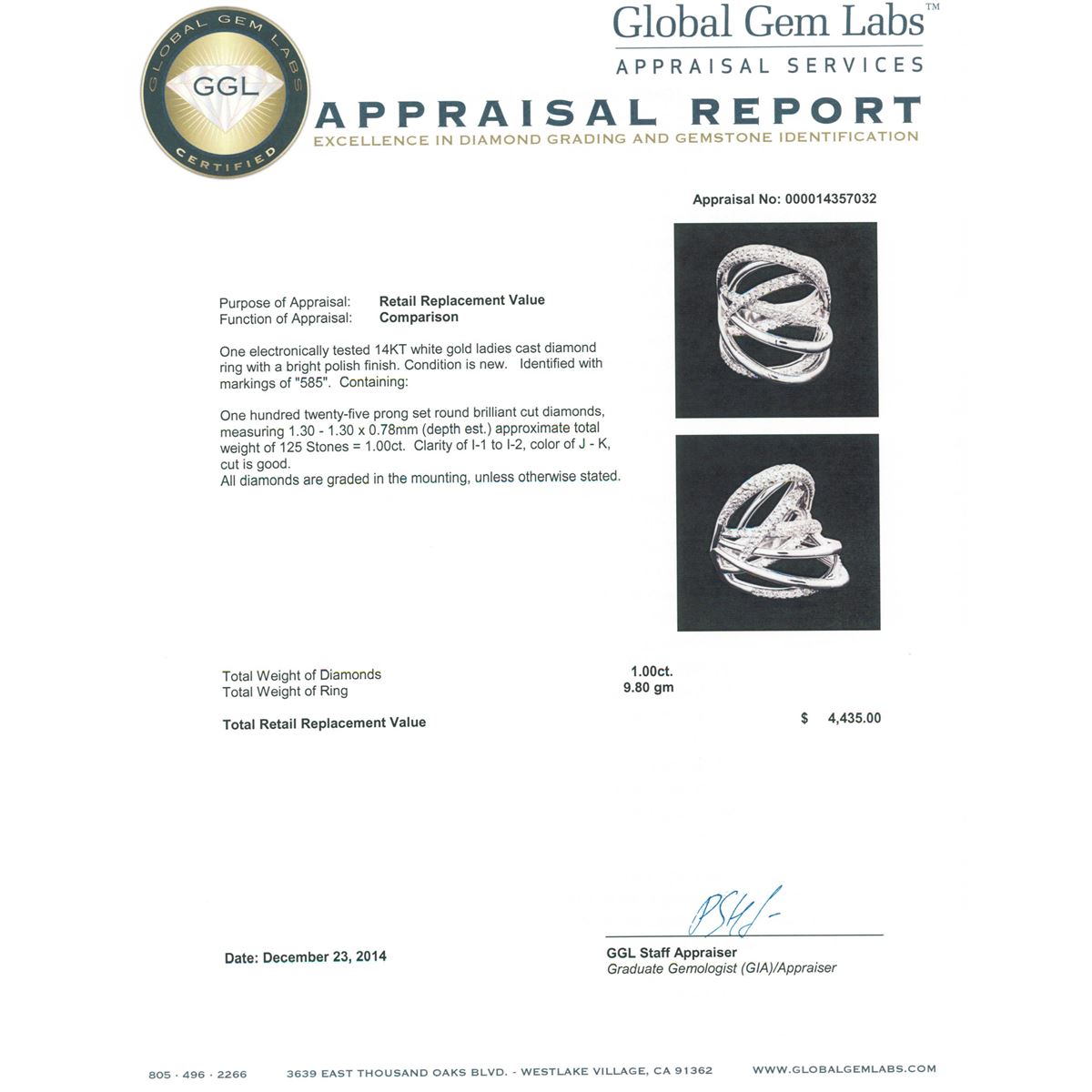 One electronically tested 14KT white gold ladies cast diamond ring with a bright polish finish. Identified with markings of "585". Condition is new. Containing: One Hundred Twenty-Five prong set round brilliant cut diamonds, measuring 1.30 - 1.30 x 0.78mm (depth est.) approximate total weight of 125 Stones = 1.00ct. Clarity: I-1 to I-2. Color: J - K, Cut is Good. All diamonds are graded in the mounting, unless otherwise stated. Total Weight of Diamonds 1.00ct. Total Weight of Ring 9.80 grams. GGL Appraised at $4,435.00.