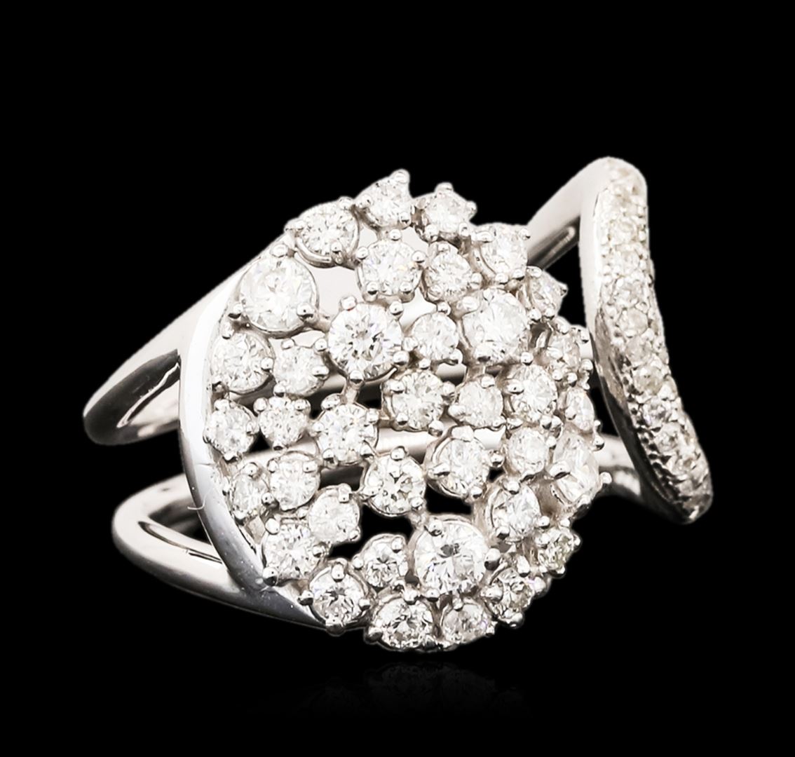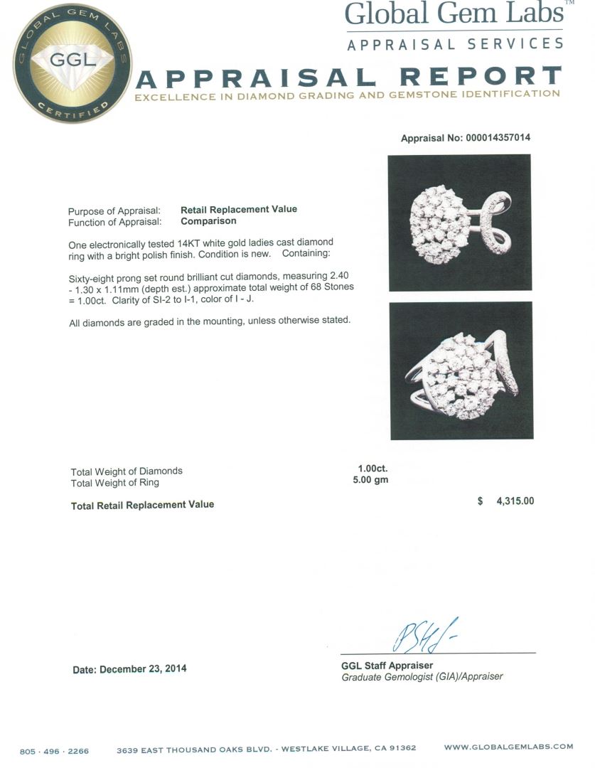 One electronically tested 14KT white gold ladies cast diamond ring with a bright polish finish. Condition is new. Containing: Sixty-Eight prong set round brilliant cut diamonds, measuring 2.40 - 1.30 x 1.11mm (depth est.) approximate total weight of 68 Stones = 1.00ct. Clarity: SI-2 to I-1. Color: I - J. All diamonds are graded in the mounting, unless otherwise stated. Total Weight of Diamonds 1.00ct. Total Weight of Ring 5.00 grams. GGL Appraised at $4,315.00.
