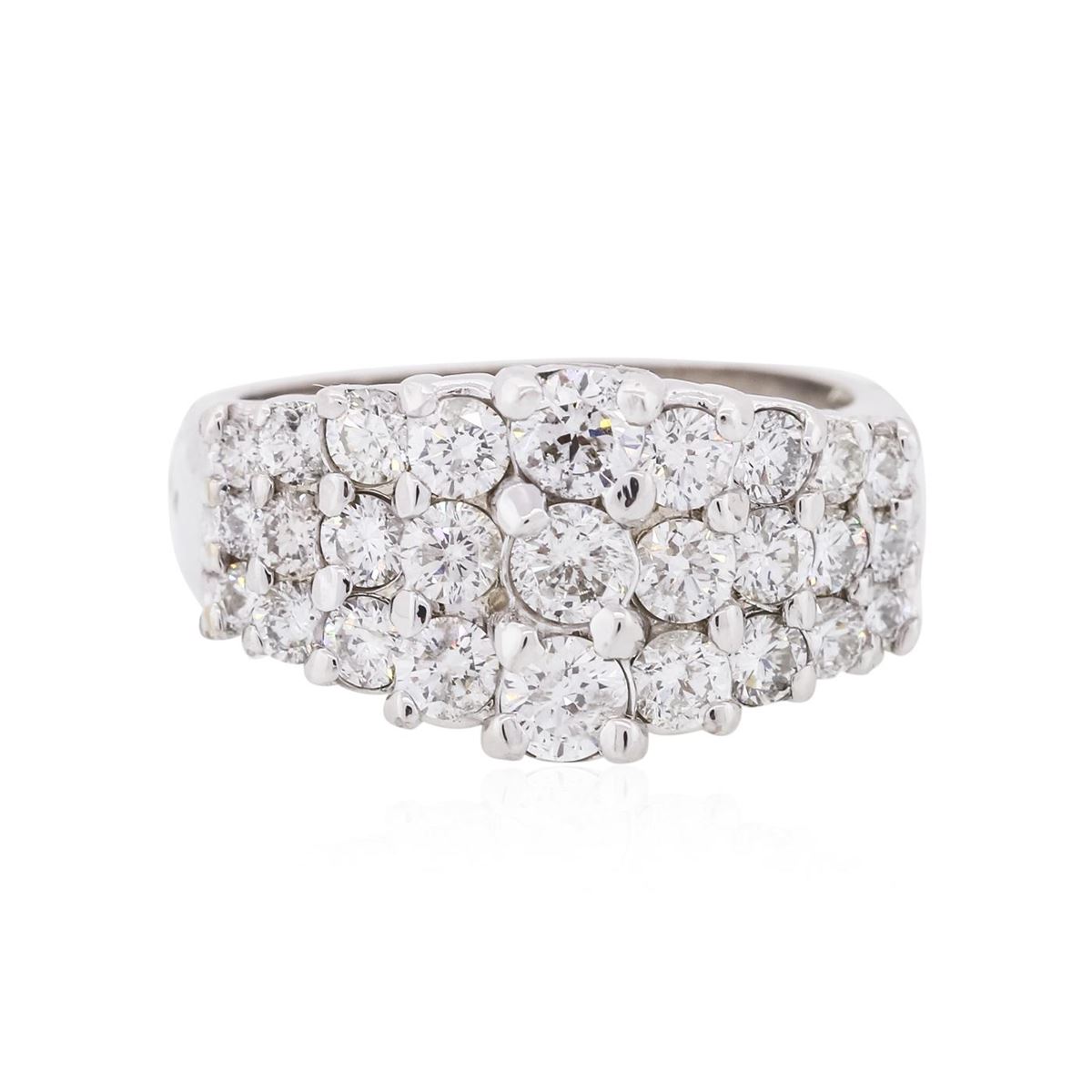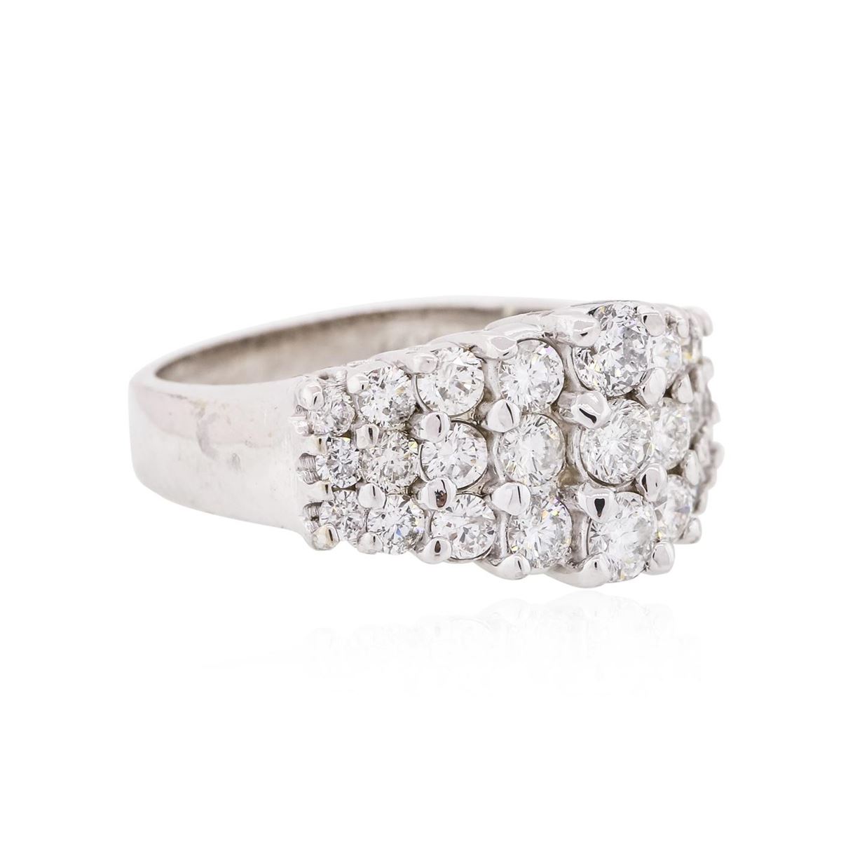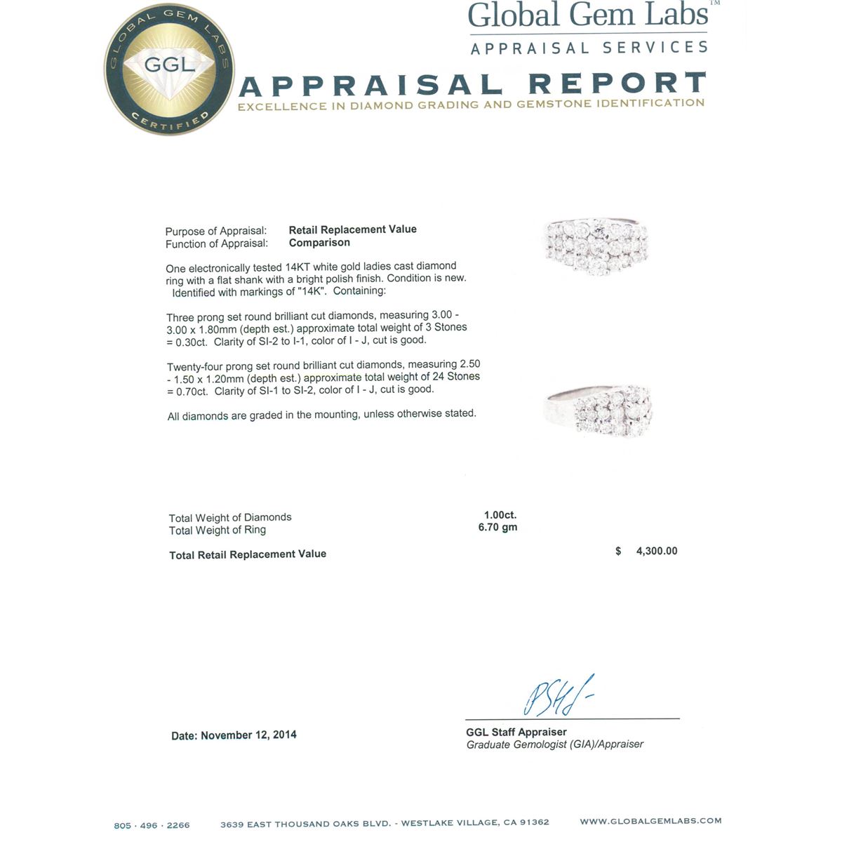 One electronically tested 14KT white gold ladies cast diamond ring with a flat shank with a bright polish finish. Identified with markings of "14K". Condition is new. Containing: Three prong set round brilliant cut diamonds, measuring 3.00 - 3.00 x 1.80mm (depth est.) approximate total weight of 3 Stones = 0.30ct. Clarity: SI-2 to I-1. Color: I - J, Cut is Good. Twenty-Four prong set round brilliant cut diamonds, measuring 2.50 - 1.50 x 1.20mm (depth est.) approximate total weight of 24 Stones = 0.70ct. Clarity: SI-1 to SI-2. Color: I - J, Cut is Good. All diamonds are graded in the mounting, unless otherwise stated. Total Weight of Diamonds 1.00ct. Total Weight of Ring 6.70 grams. GGL Appraised at $4,300.00.