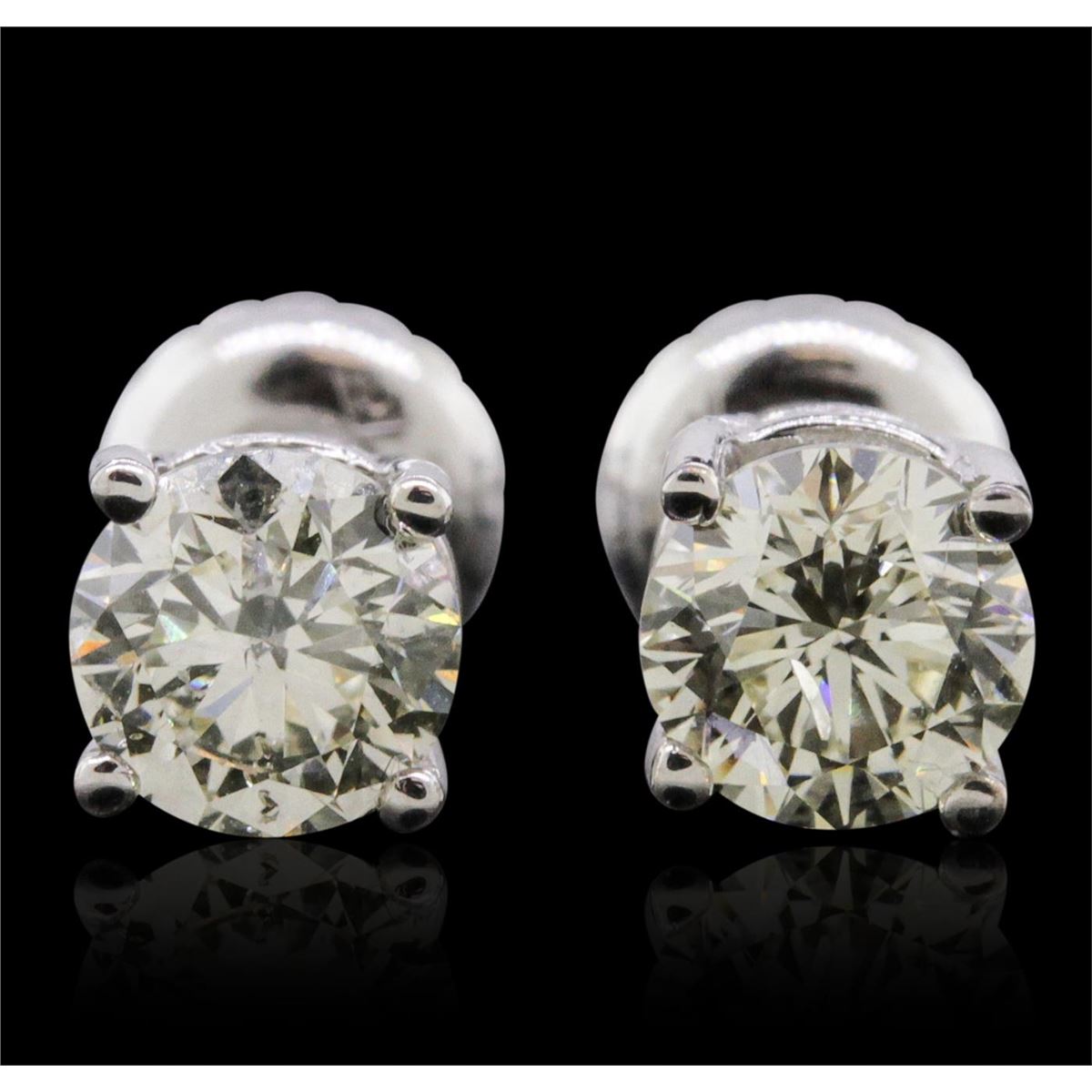 One pair electronically tested 14KT white gold cast & assembled diamond solitaire earrings with screw backs. Condition is new, good workmanship. Containing: One prong set round brilliant cut diamond, measuring 4.90 - 4.90 x 3.15mm (depth est.), 6.00% GTCF approximate weight of 0.50ct with a medium strong green blue fluorescence. Graded in the setting. Clarity: SI-2. Depth: 64.3%. Table 61.2%. One prong set round brilliant cut diamond, measuring 5.00 - 4.90 x 3.15mm (depth est.), 4.00% GTCF approximate weight of 0.50ct. Graded in the setting. Clarity: SI-2. Depth: 63.6%. Table 56.2%. Total Weight of Diamonds 1.00ct. Total Weight of Earrings 1.01 grams. AIG Appraised at $3,100.00.