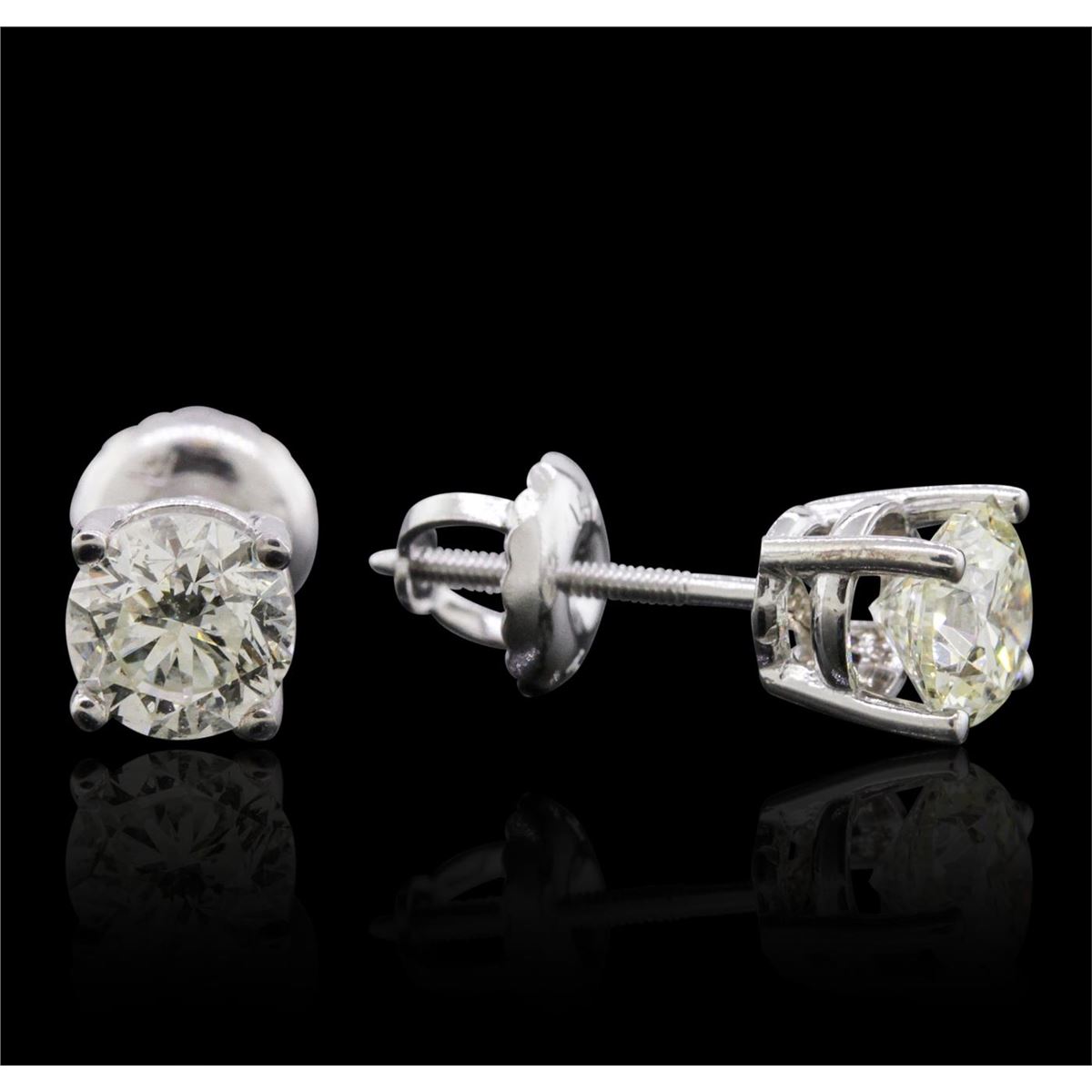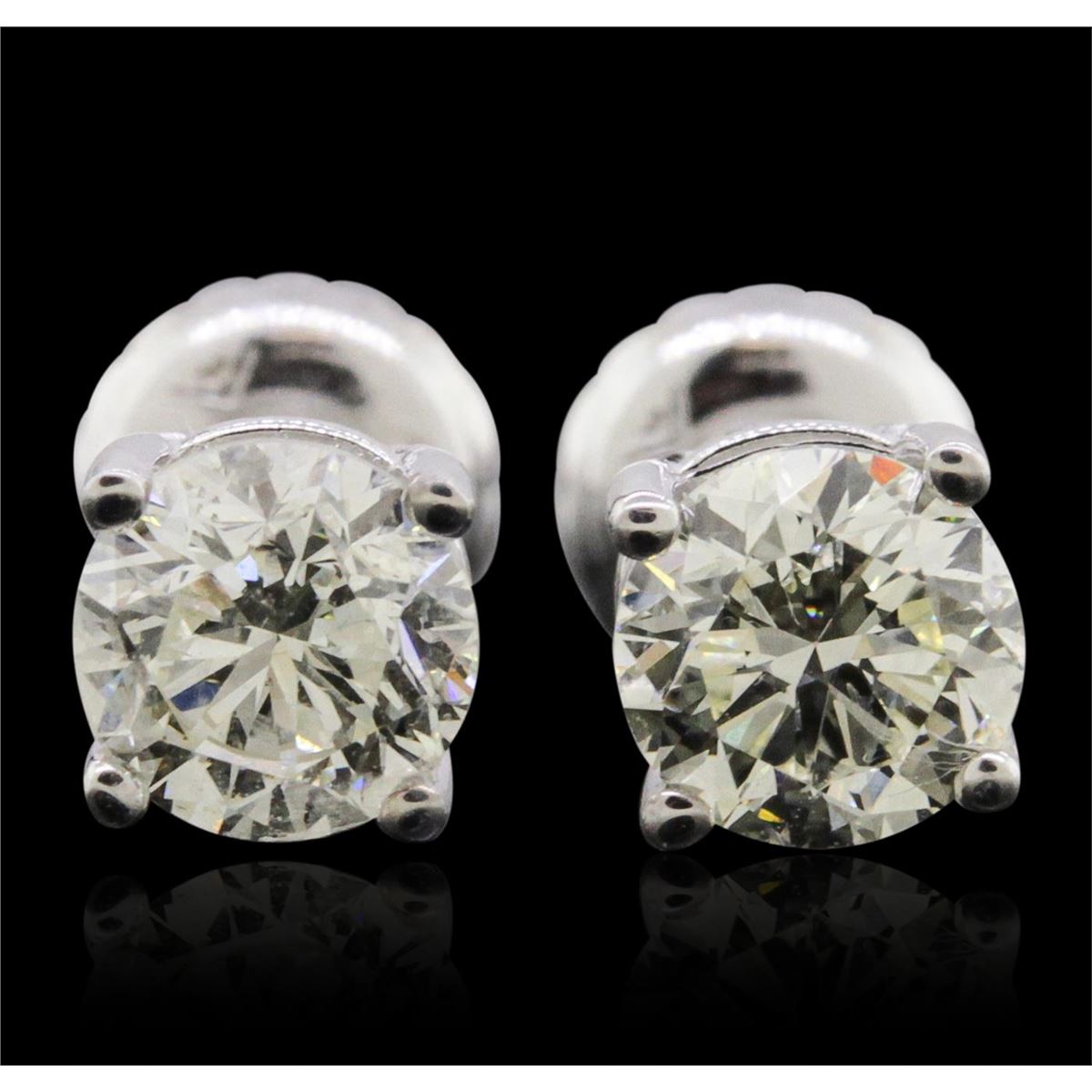 One pair electronically tested 14KT white gold cast & assembled diamond solitaire earrings with screw backs. Condition is new, good workmanship. Containing: One prong set round brilliant cut diamond, measuring 4.90 - 4.90 x 3.25mm (depth est.), 3.00% GTCF approximate weight of 0.50ct. Graded in the setting. Clarity: I-1. Color: 66.3%. Table 58.4%. One prong set round brilliant cut diamond, measuring 5.00 - 4.90 x 3.16mm (depth est.), 5.00% GTCF approximate weight of 0.50ct with a faint blue fluorescence. Graded in the setting. Clarity: I-1. Color: 63.8%. Table 62.6%. Total Weight of Diamonds 1.00ct. Total Weight of Earrings 1.00 grams. AIG Appraised at $3,400.00.