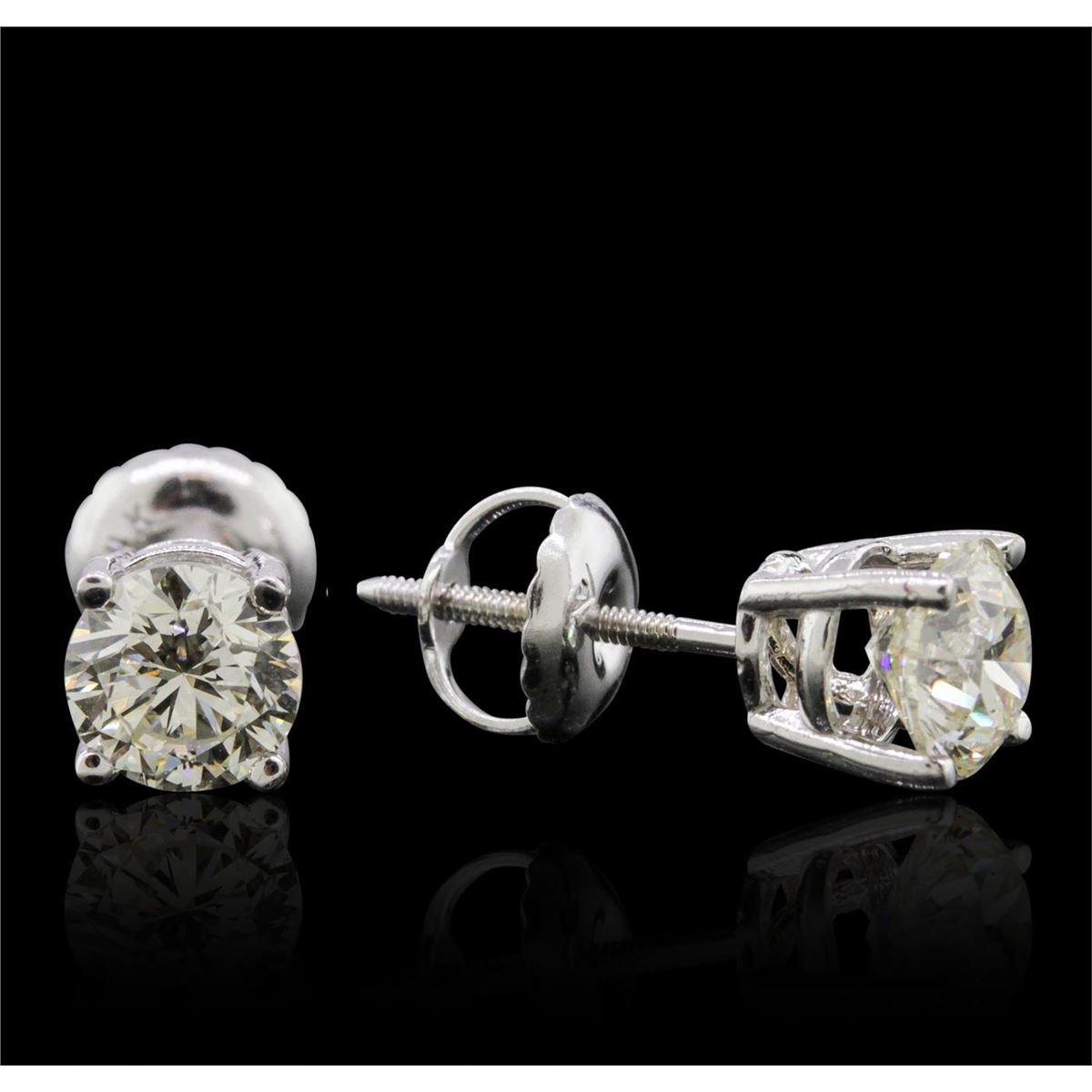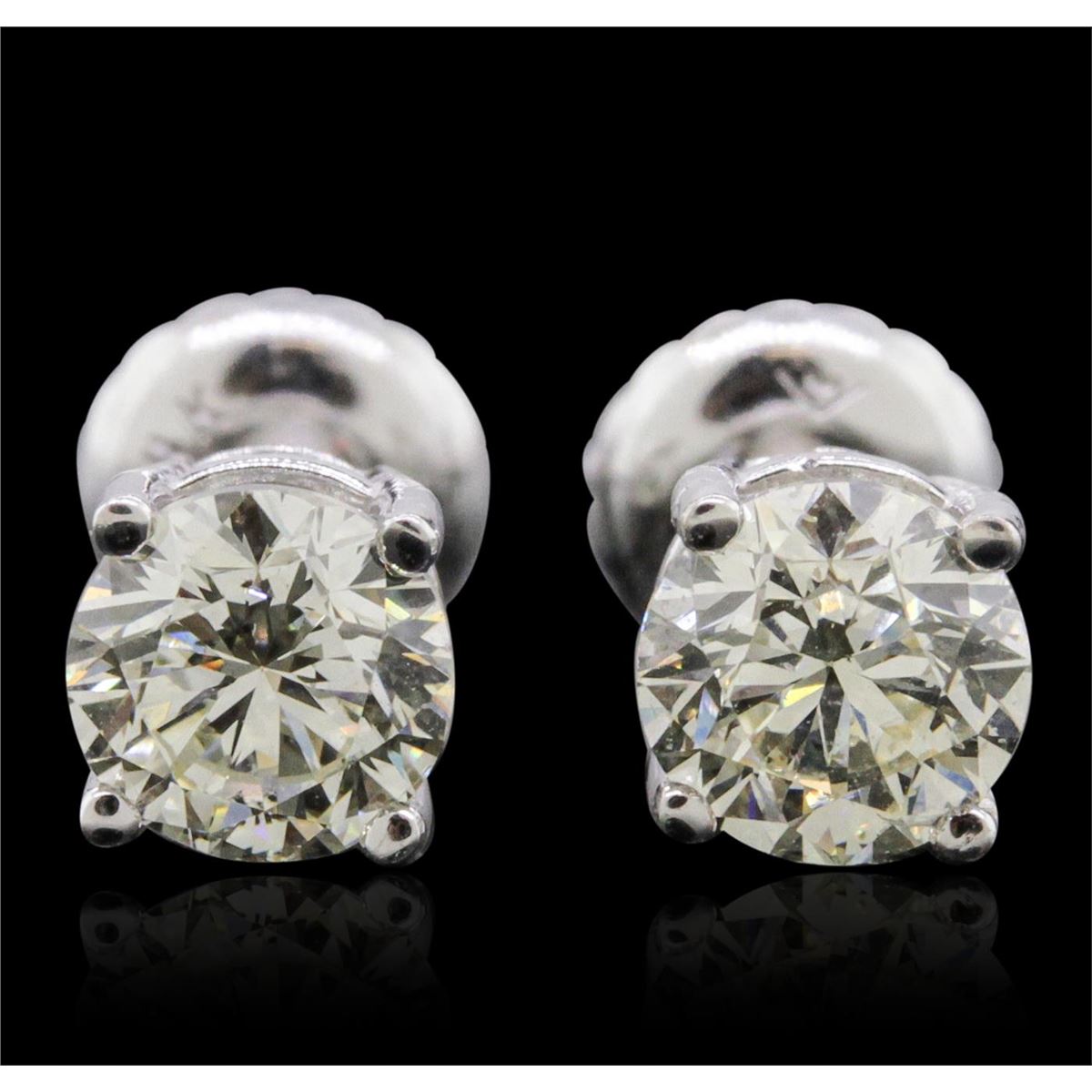 One pair electronically tested 14KT white gold cast & assembled diamond solitaire earrings with screw backs. Condition is new, good workmanship. Containing: One prong set round brilliant cut diamond, measuring 4.90 - 4.88 x 3.12mm (depth est.), 7.00% GTCF approximate weight of 0.49ct. Graded in the setting. Clarity: SI-2. Depth: 63.8%. Table 58.3%. One prong set round brilliant cut diamond, measuring 5.00 - 5.00 x 3.30mm (depth est.), 2.00% GTCF approximate weight of 0.51ct with a faint blue fluorescence. Graded in the setting. Clarity: SI-2. Depth: 66.0%. Table 52.0%. Total Weight of Diamonds 1.00ct. Total Weight of Earrings 0.98 grams. AIG Appraised at $3,050.00.