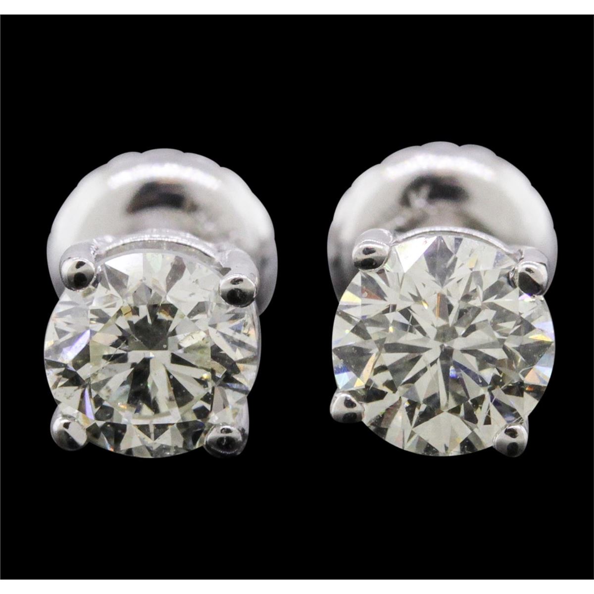 One pair electronically tested 14KT white gold cast & assembled diamond solitaire earrings with screw backs. Condition is new, good workmanship. Containing: One prong set round brilliant cut diamond, measuring 5.03 - 5.01 x 3.31mm (depth est.), 2.00% GTCF approximate weight of 0.52ct with a very strong blue fluorescence. Graded in the setting. Clarity: SI-2. Color: 65.9%. Table 53.4%. One prong set round brilliant cut diamond, measuring 4.83 - 4.80 x 3.01mm (depth est.), 10.00% GTCF approximate weight of 0.48ct with a very strong blue fluorescence. Graded in the setting. Clarity: SI-2. Color: K. Depth 62.5%. Table 61.2%. Total Weight of Diamonds 1.00ct. Total Weight of Earrings 1.00 grams. AIG Appraised at $4,200.00.