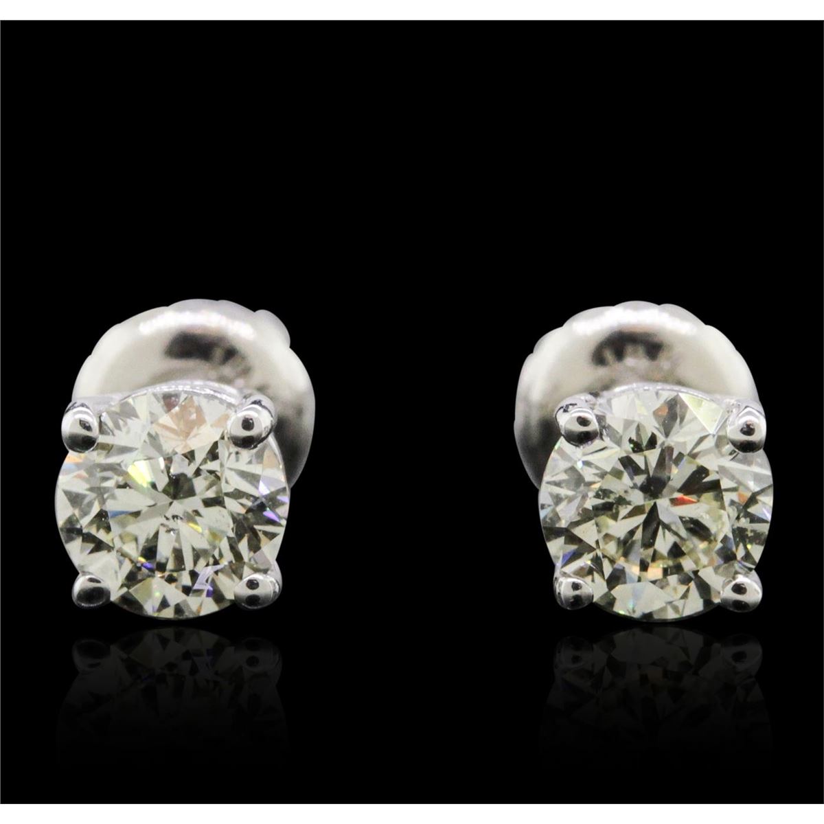 One pair electronically tested 14KT white gold cast & assembled diamond solitaire earrings with screw backs. Condition is new, good workmanship. Containing: One prong set round brilliant cut diamond, measuring 5.00 - 4.90 x 3.15mm (depth est.), 3.00% GTCF approximate weight of 0.50ct. Graded in the setting. Clarity: SI-2 One prong set round brilliant cut diamond, measuring 5.00 - 4.96 x 3.20mm (depth est.), 3.00% GTCF approximate weight of 0.50ct. Graded in the setting. Clarity: SI-2. Depth: 64.3%. Table 54.2%. Total Weight of Diamonds 1.00ct. Total Weight of Earrings 0.96 grams. AIG Appraised at $3,100.00.