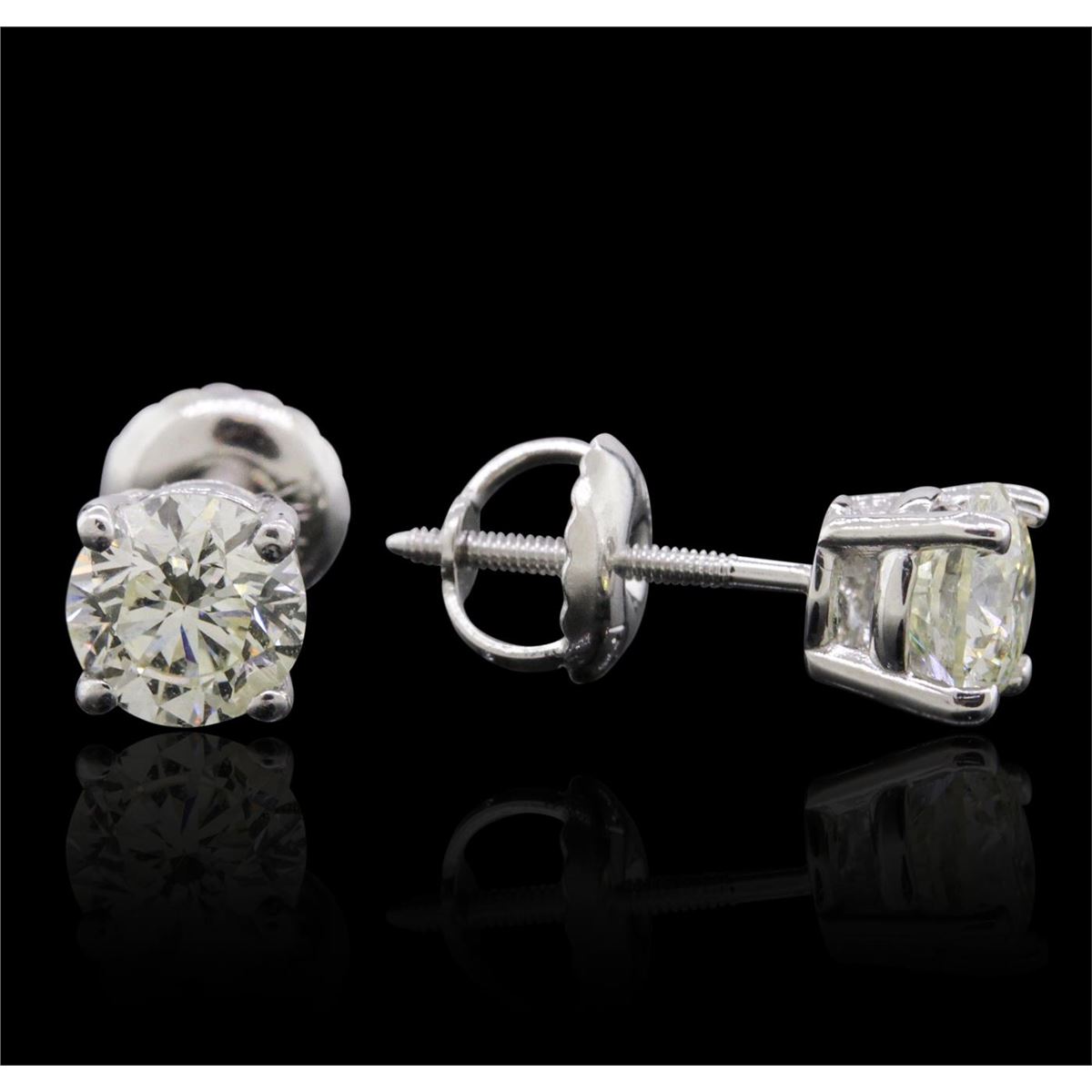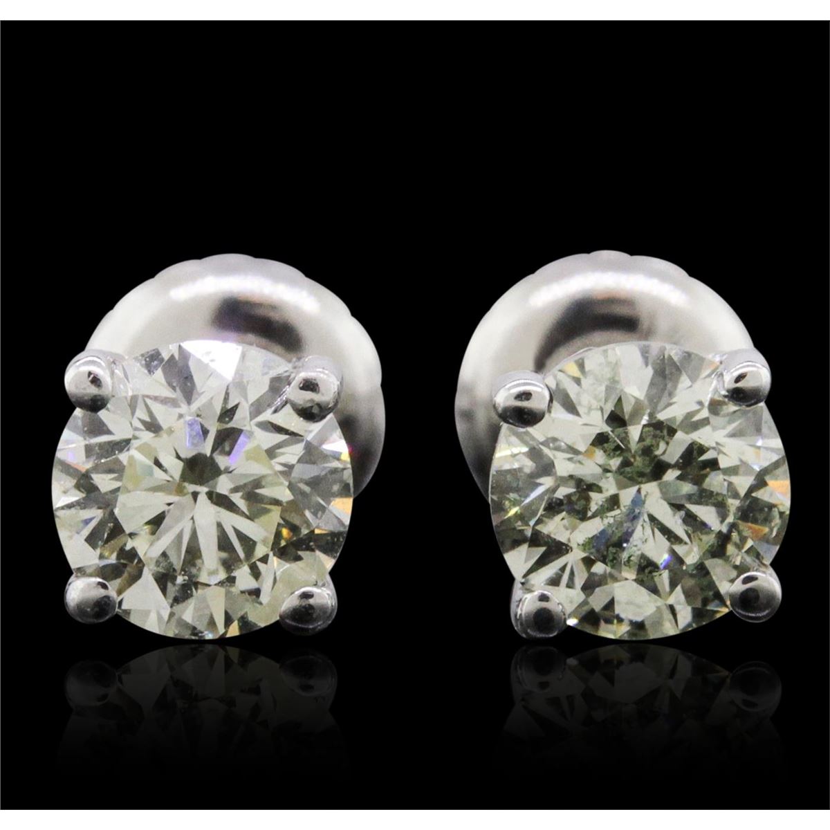 One pair electronically tested 14KT white gold cast & assembled diamond solitaire earrings with screw backs. Condition is new, good workmanship. Containing: One prong set round brilliant cut diamond, measuring 5.00 - 5.00 x 3.10mm (depth est.), 2.00% GTCF approximate weight of 0.48ct with a medium blue fluorescence. Graded in the setting. Clarity: I-1. Depth: 62.0%. Table 56.0%. One prong set round brilliant cut diamond, measuring 5.00 - 5.00 x 3.20mm (depth est.), 4.00% GTCF approximate weight of 0.52ct with a medium blue fluorescence. Graded in the setting. Clarity: I-1. Depth: 64.0%. Table 55.4%. Total Weight of Diamonds 1.00ct. Total Weight of Earrings 0.97 grams. AIG Appraised at $2,680.00.