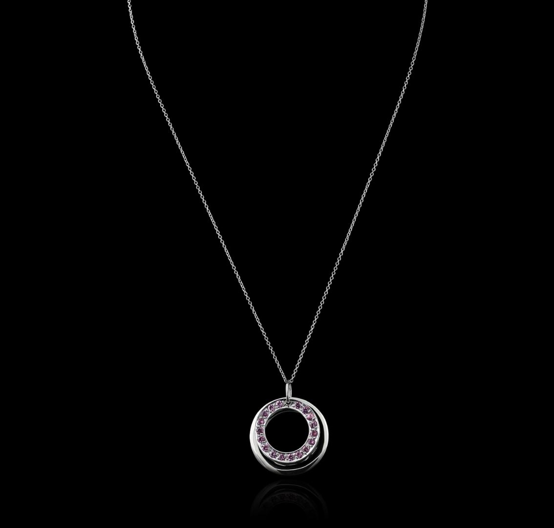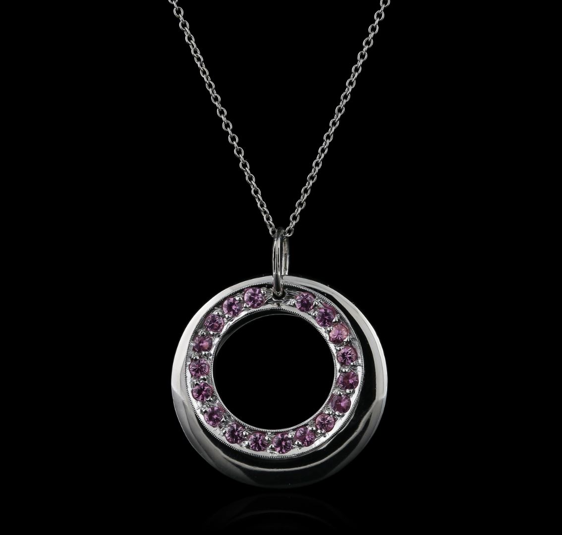 One pendant with chain featuring: 14KT white gold weighing 8.98 grams containing pink sapphires with a total weight of 1.00ct.