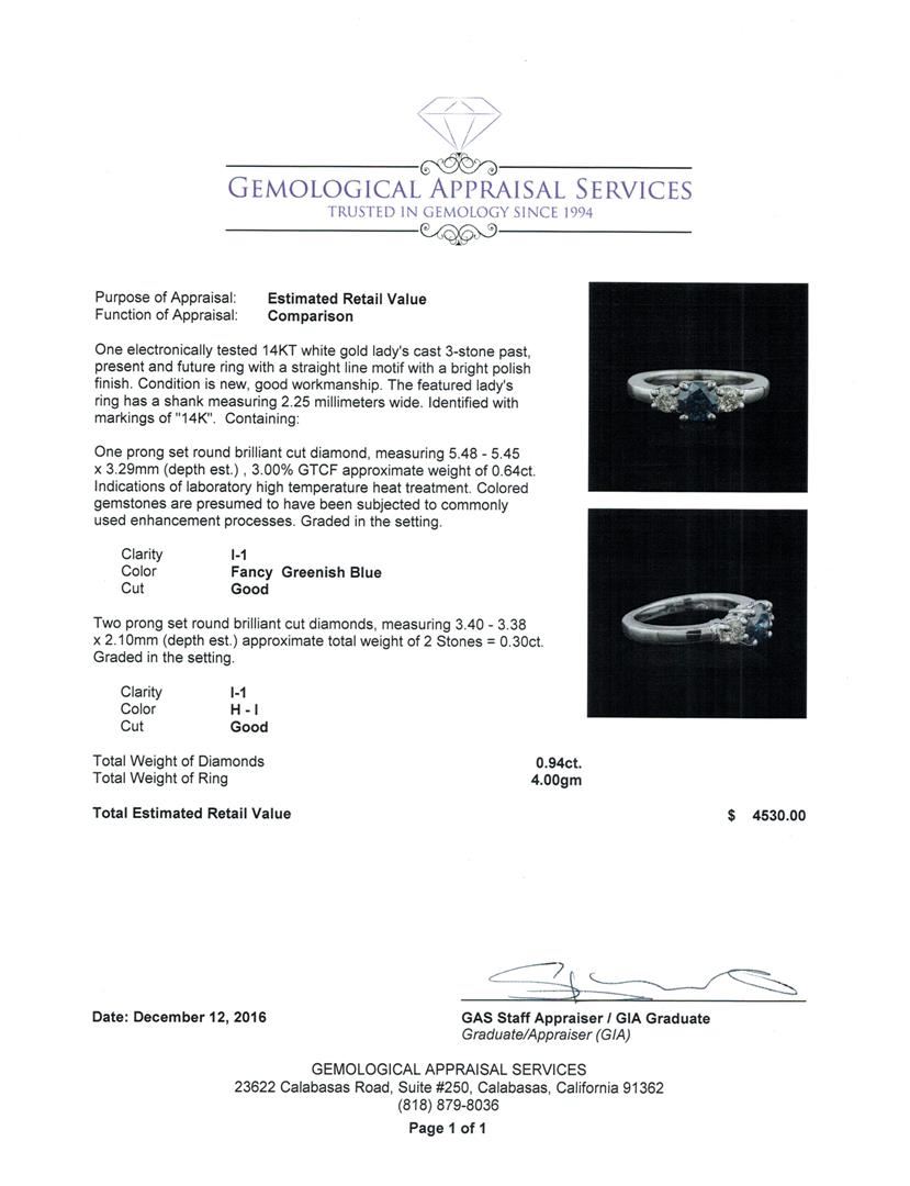 One ring featuring: 14KT white gold weighing 4.00 grams containing one blue diamond center stone with a total weight of 0.64ct and two side diamonds with a total weight of 0.37ct.