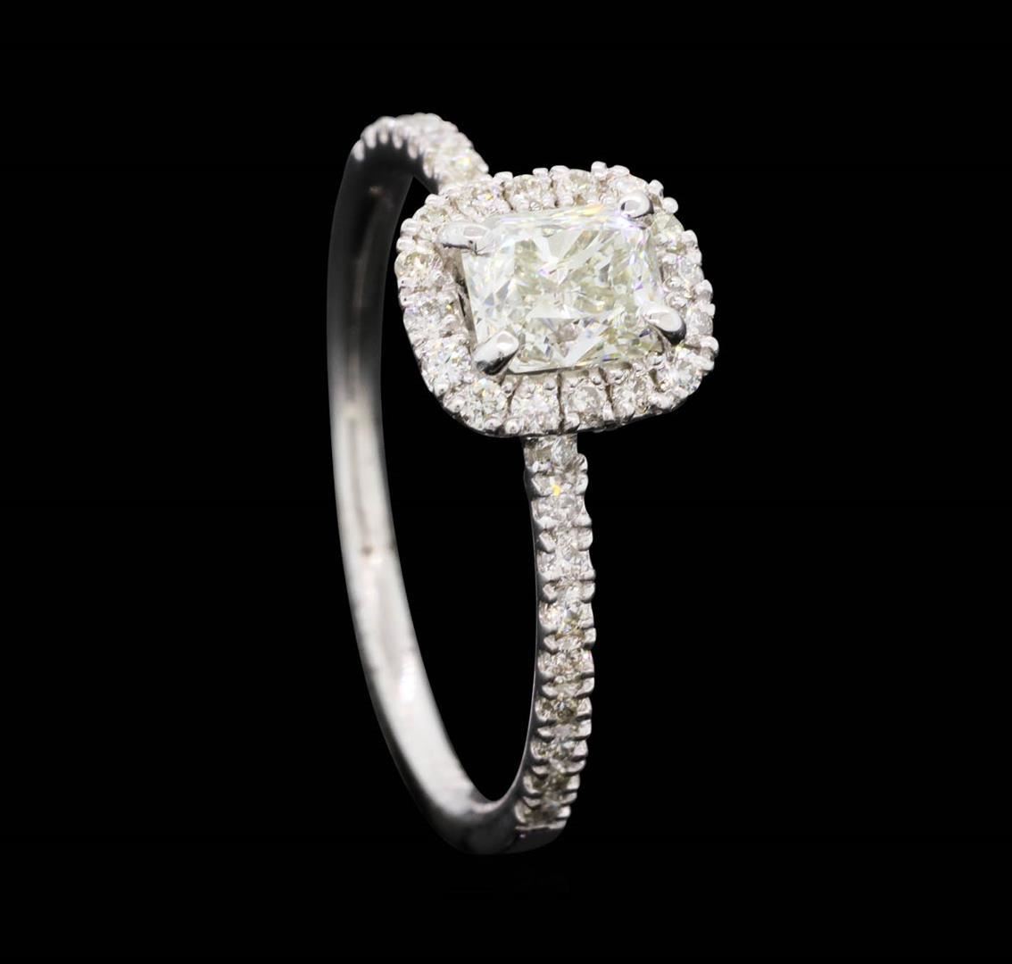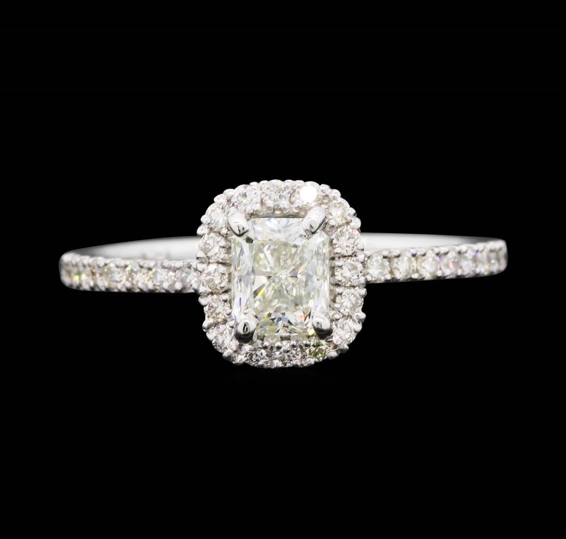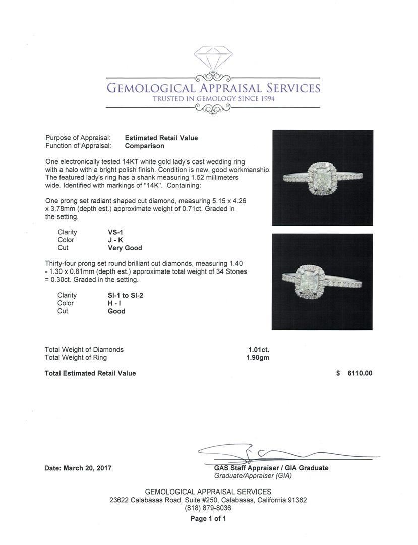 One electronically tested 14KT white gold lady's cast wedding ring with a halo with a bright polish finish. The featured lady's ring has a shank measuring 1.52 millimeters wide. Identified with markings of "14K". Condition is new, good workmanship. Containing: One prong set radiant shaped cut diamond, measuring 5.15 x 4.26 x 3.78mm (depth est.) approximate weight of 0.71ct. Graded in the setting. Color J-K, Clarity VS-1, Cut Very Good. Thirty-Four prong set round brilliant cut diamonds, measuring 1.40 - 1.30 x 0.81mm (depth est.) approximate total weight of 34 Stones = 0.30 ct. Graded in the setting. Color H-I, Clarity SI-1 - SI-2, Cut is Good. Total Weight of Diamonds = 1.01ctw. Total Weight of Ring 1.90gm. GAS Appraised.