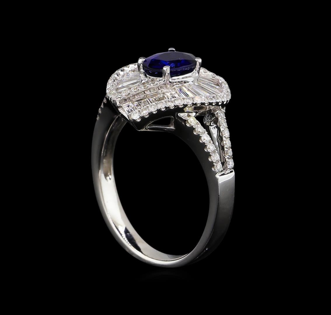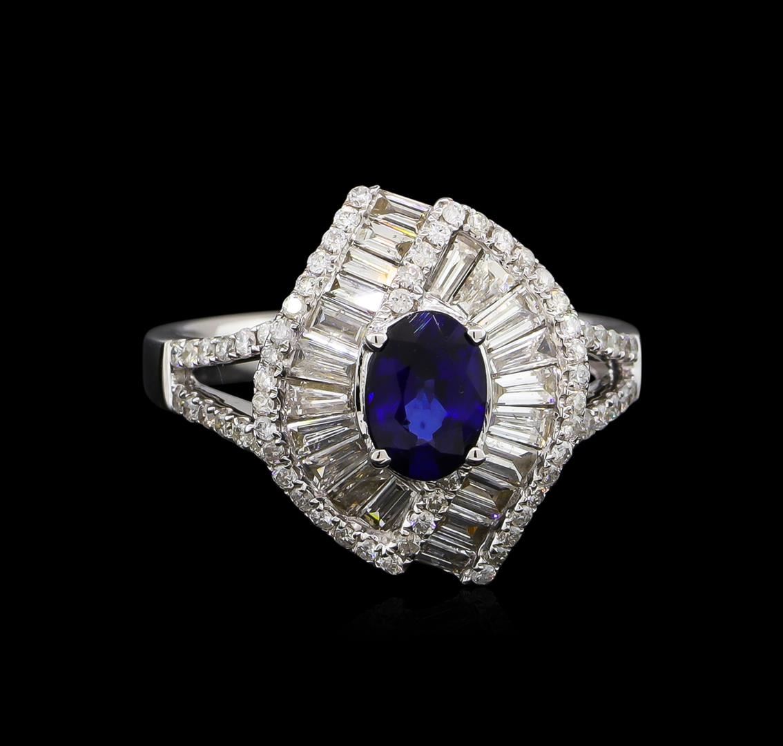 One electronically tested 14KT white gold ladies cast sapphire and diamond ring with a bright polish finish. Condition is new, good workmanship. The featured sapphire is set within a wrap around diamond bezel, supported by diamond set split shoulders and completed by a three millimeter wide band. Identified with markings of "14K". Containing: One prong set oval mixed cut natural blue sapphire, measuring 6.90 x 5.00 x 3.00mm, 6%. bulge factor, approximate weight of 1.01ct., clarity is eye clean, type II, medium dark, moderately strong, violetish blue color, (GIA vB 6/4), cut is good. Transmitting light with no distortion, transparent. Indications of laboratory high temperature diffusion treatment. Graded in the setting. Sixty-Eight prong set round brilliant cut diamonds, measuring 1.10 - 1.00 x 0.63mm (depth est.) approximate. Total Weight of 68 Stones = 0.38ct. Graded in the setting. Clarity: I-1 to I-2. Color: F - H Twenty-One channel set baguette cut diamonds, measuring from 2.40 x 1.20 x 0.84mm (depth est.) to 3.20 x 1.70 x 1.19mm (depth est.) approximate. Total Weight of 21 Stones = 0.79ct. Graded in the setting. Clarity: SI-1 to SI-2. Color: G - I. Total Weight of Colored Stones 1.01ct. Total Weight of Diamonds 1.17ct. Total Weight of Ring 5.80grams. AIG Appraised at $5,125.00.