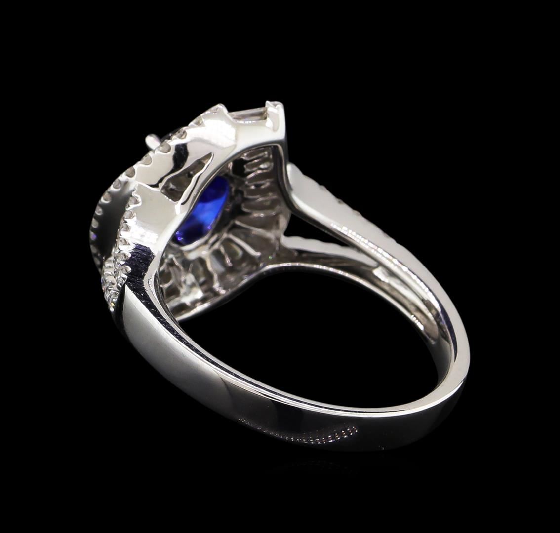 One electronically tested 14KT white gold ladies cast sapphire and diamond ring with a bright polish finish. Condition is new, good workmanship. The featured sapphire is set within a wrap around diamond bezel, supported by diamond set split shoulders and completed by a three millimeter wide band. Identified with markings of "14K". Containing: One prong set oval mixed cut natural blue sapphire, measuring 6.90 x 5.00 x 3.00mm, 6%. bulge factor, approximate weight of 1.01ct., clarity is eye clean, type II, medium dark, moderately strong, violetish blue color, (GIA vB 6/4), cut is good. Transmitting light with no distortion, transparent. Indications of laboratory high temperature diffusion treatment. Graded in the setting. Sixty-Eight prong set round brilliant cut diamonds, measuring 1.10 - 1.00 x 0.63mm (depth est.) approximate. Total Weight of 68 Stones = 0.38ct. Graded in the setting. Clarity: I-1 to I-2. Color: F - H Twenty-One channel set baguette cut diamonds, measuring from 2.40 x 1.20 x 0.84mm (depth est.) to 3.20 x 1.70 x 1.19mm (depth est.) approximate. Total Weight of 21 Stones = 0.79ct. Graded in the setting. Clarity: SI-1 to SI-2. Color: G - I. Total Weight of Colored Stones 1.01ct. Total Weight of Diamonds 1.17ct. Total Weight of Ring 5.80grams. AIG Appraised at $5,125.00.