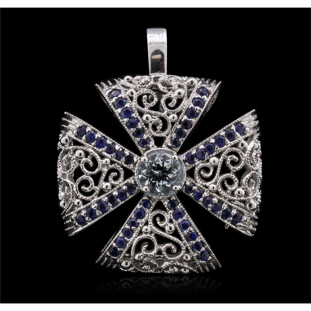 One electronically tested 14KT white gold Ladies combination cast & assembled pendant with a bright polish finish. Condition is new. Containing: One bezel set round modified brilliant cut natural aquamarine, measuring 6.50 - 6.50 x 4.23 mm, approximate weight of 1.01ct., clarity is eye clean, type I, light, slightly grayish, blue color, (GIA B 3/2), cut is very good. Forty-eight bead set round modified brilliant cut natural blue sapphires, measuring 1.80 - 1.80 x 1.17 mm, approximate. Total Weight of 1.44ct., clarity is heavily included, type II, dark, moderately strong, blue color, (GIA B 7/4), cut is good. Colored gemstones are presumed to have been subjected to commonly used color/clarity enhancement processes. Total Weight of Colored Stones 2.45ct. Total Weight of Pendant 11.50 grams.