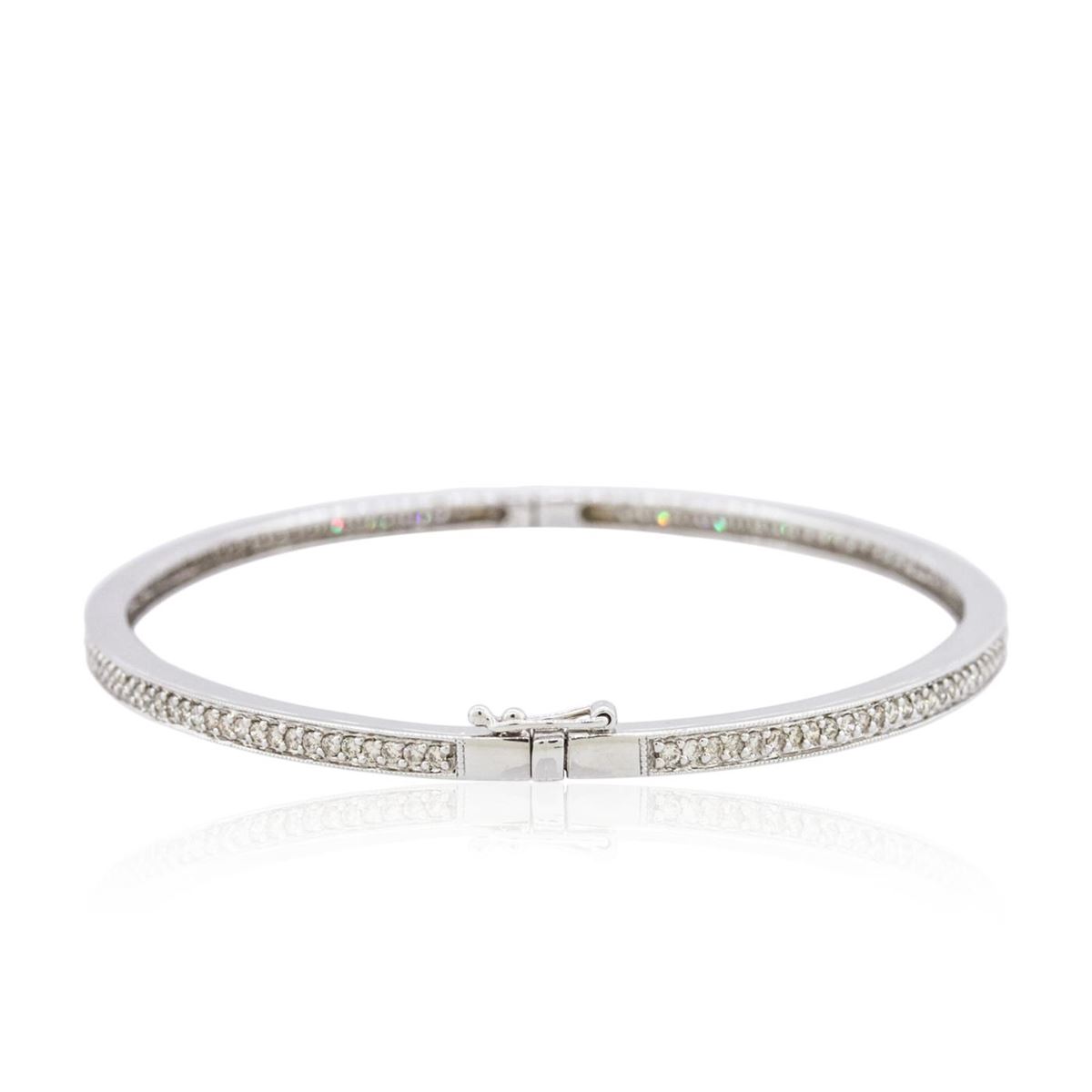 One electronically tested 14KT white gold ladies cast & assembled diamond bangle bracelet. Six and one-half inch wearable length bangle bracelet features mirroring diamond set curvatures supported by a hinged shoulder, completed by a concealed clasp with safety. Bright polish finish with milgrain detailing. Identified with markings of "14K". Condition is new, good workmanship. Containing: One Hundred Twenty-Four bead set round brilliant cut diamonds, measuring 1.30 - 1.30 x 0.78mm (depth est.) approximate total weight of 124 Stones = 1.01ct. Faint brown secondary color throughout. Graded in the setting. Clarity: SI-2 to I-1. Color: J - L. Total Weight of Diamonds 1.01ct. Total Weight of Bangle Bracelet 9.91 grams. AIG Appraised at $4,595.00.