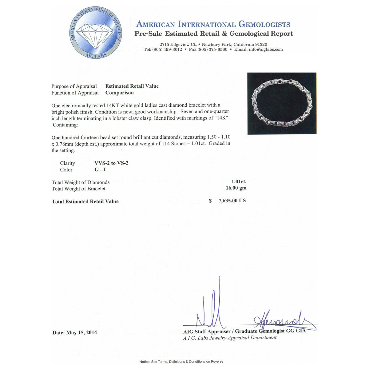 One electronically tested 14KT white gold ladies cast diamond bracelet with a bright polish finish. Condition is new, good workmanship. Seven and one-quarter inch length terminating in a lobster claw clasp. Identified with markings of "14K". Containing: One Hundred Fourteen bead set round brilliant cut diamonds, measuring 1.50 - 1.10 x 0.78mm (depth est.) approximate. Total Weight of 114 Stones = 1.01ct. Graded in the setting. Clarity: VVS-2 to VS-2. Color: G - I. Total Weight of Diamonds 1.01ct. Total Weight of Bracelet 16.00 grams. AIG Appraised at $7,635.00.