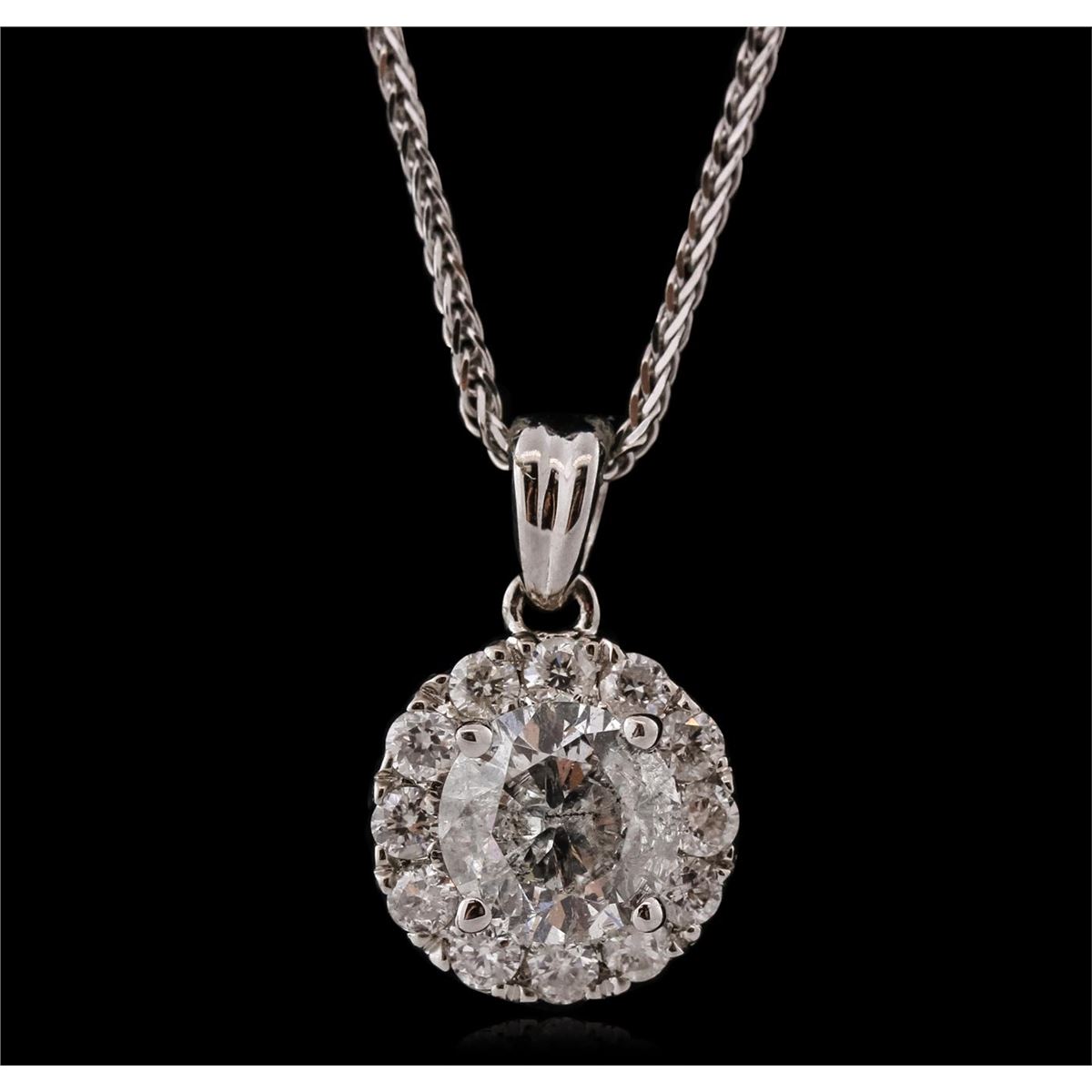 One electronically tested 14KT white gold ladies combination cast & assembled diamond pendant & chain 18.0" long, medium fancy cable with a lobster claw clasp with a bright polish finish. Identified with markings of "14K". Condition is new. Containing: One prong set round brilliant cut diamond, measuring 5.92 - 5.91 x 3.55mm (depth est.) approximate weight of 0.76ct. Clarity: I-2. Color: H, Cut is Good. Twelve prong set round brilliant cut diamonds, measuring 1.80 - 1.80 x 1.08mm (depth est.) approximate total weight of 12 Stones = 0.26ct. Clarity: SI-2 to I-2. Color: H - J, Cut is Good. All diamonds are graded in the mounting, unless otherwise stated. Total Weight of Diamonds 1.01ct. Total Weight of Pendant & Chain 2.70 grams. GGL Appraised at $5,305.00.