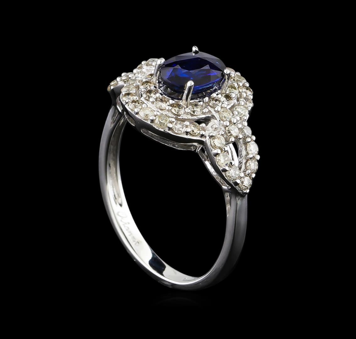 One electronically tested 14KT white gold ladies combination cast & assembled sapphire and diamond ring with a flat shank with a bright polish finish. Identified with markings of "14K". Condition is new. Containing: One prong set oval modified brilliant cut natural blue sapphire, measuring 7.09 x 5.19 x 3.37mm, approximate weight of 1.02ct., clarity is eye clean, type II, medium dark, moderately strong, blue color, (GIA B 6/4), cut is very good. Forty-Eight prong set round brilliant cut diamonds, measuring 1.50 - 1.50 x 0.90mm (depth est.) approximate total weight of 48 Stones = 0.59ct. Clarity: I-1 to I-2. Color: J - K, Cut is Good. Colored gemstones are presumed to have been subjected to commonly used enhancement processes. All diamonds and colored gemstones are graded in the mounting, unless otherwise stated. Total Weight of Colored Stones 1.02ct. Total Weight of Diamonds 0.59ct. Total Weight of Ring 3.80 grams. GGL Appraised at $3,230.00.