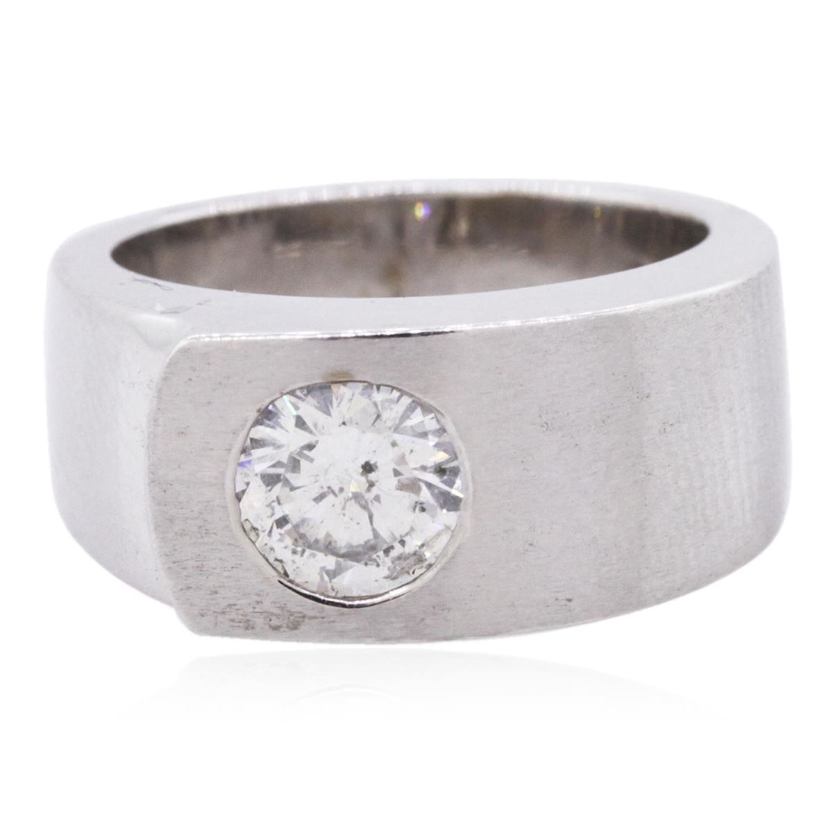 One electronically tested 14KT white gold ladies cast diamond solitaire ring with a bright and satin finish. The ring is completed by a five millimeter wide band. Identified with markings of "K14". Condition is good. Containing: One flush set round brilliant cut diamond, measuring 6.50 - 6.40 x 3.65mm (depth est.) approximate weight of 1.02ct with a medium blue fluorescence. Graded in the setting. Clarity: I-1. Color: H. Depth 56.6%. Table 60.5%. Total Weight of Diamonds 1.02ct. Total Weight of Ring 11.97 grams. AIG Appraised at $13,480.00.
