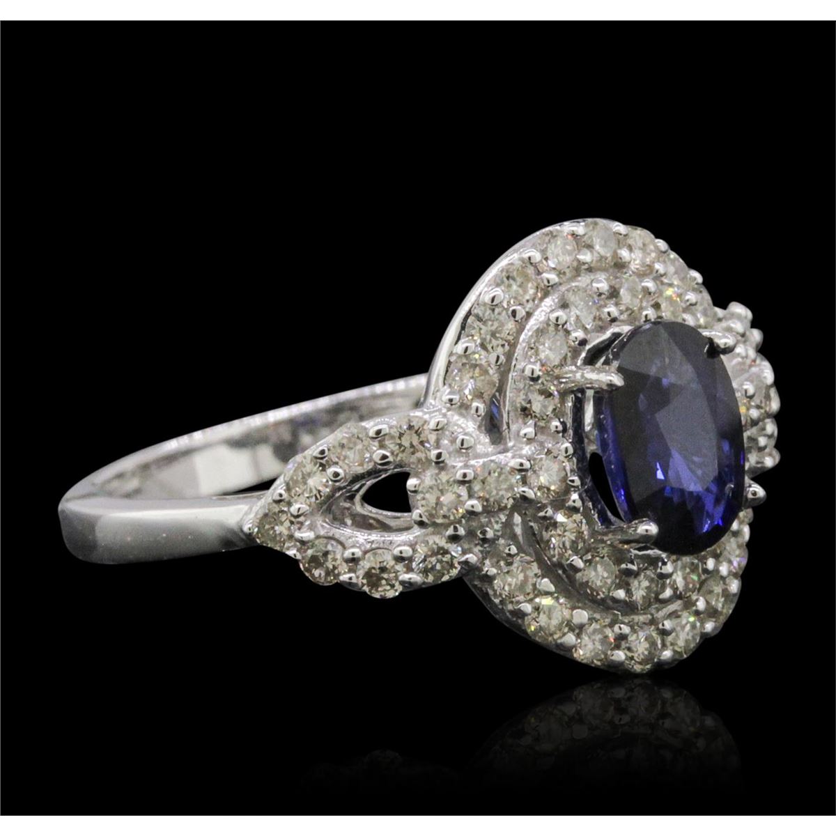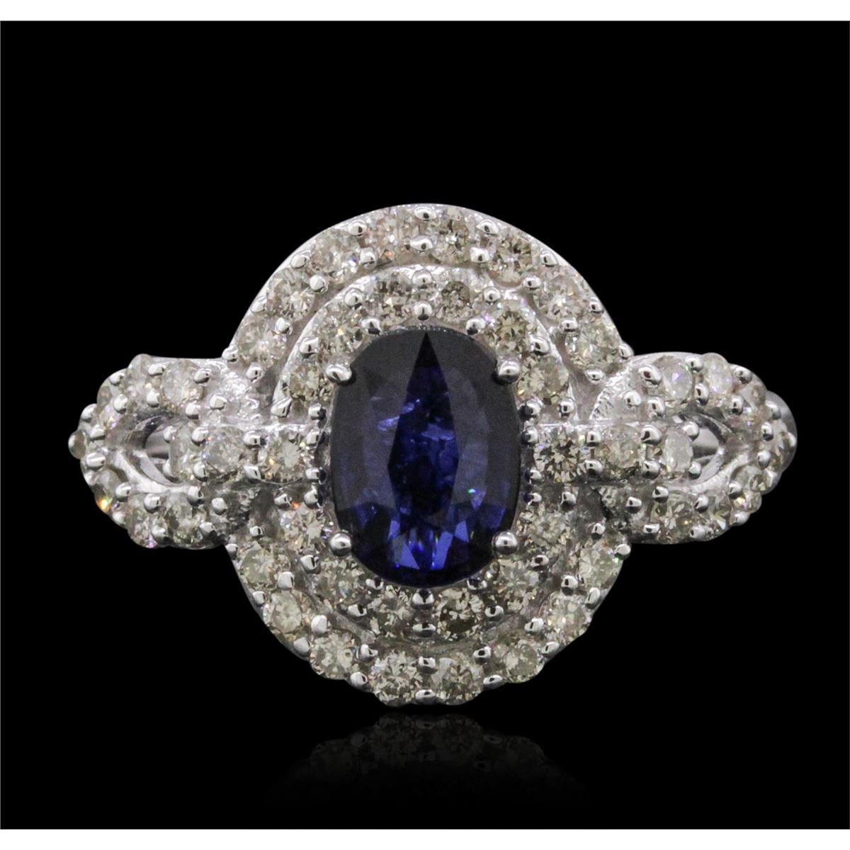 One electronically tested 14KT white gold ladies combination cast & assembled sapphire and diamond ring with a flat shank with a bright polish finish. Identified with markings of "14K". Condition is new. Containing: One prong set oval modified brilliant cut natural blue sapphire, measuring 7.09 x 5.19 x 3.37mm, approximate weight of 1.02ct., clarity is eye clean, type II, medium dark, moderately strong, blue color, (GIA B 6/4), cut is very good. Forty-Eight prong set round brilliant cut diamonds, measuring 1.50 - 1.50 x 0.90mm (depth est.) approximate total weight of 48 Stones = 0.59ct. Clarity: I-1 to I-2. Color: J - K, Cut is Good. Colored gemstones are presumed to have been subjected to commonly used enhancement processes. All diamonds and colored gemstones are graded in the mounting, unless otherwise stated. Total Weight of Colored Stones 1.02ct. Total Weight of Diamonds 0.59ct. Total Weight of Ring 3.80 grams. GGL Appraised at $3,230.00.
