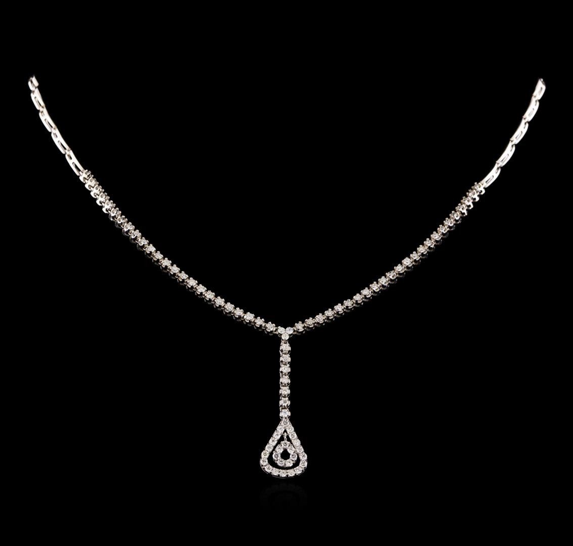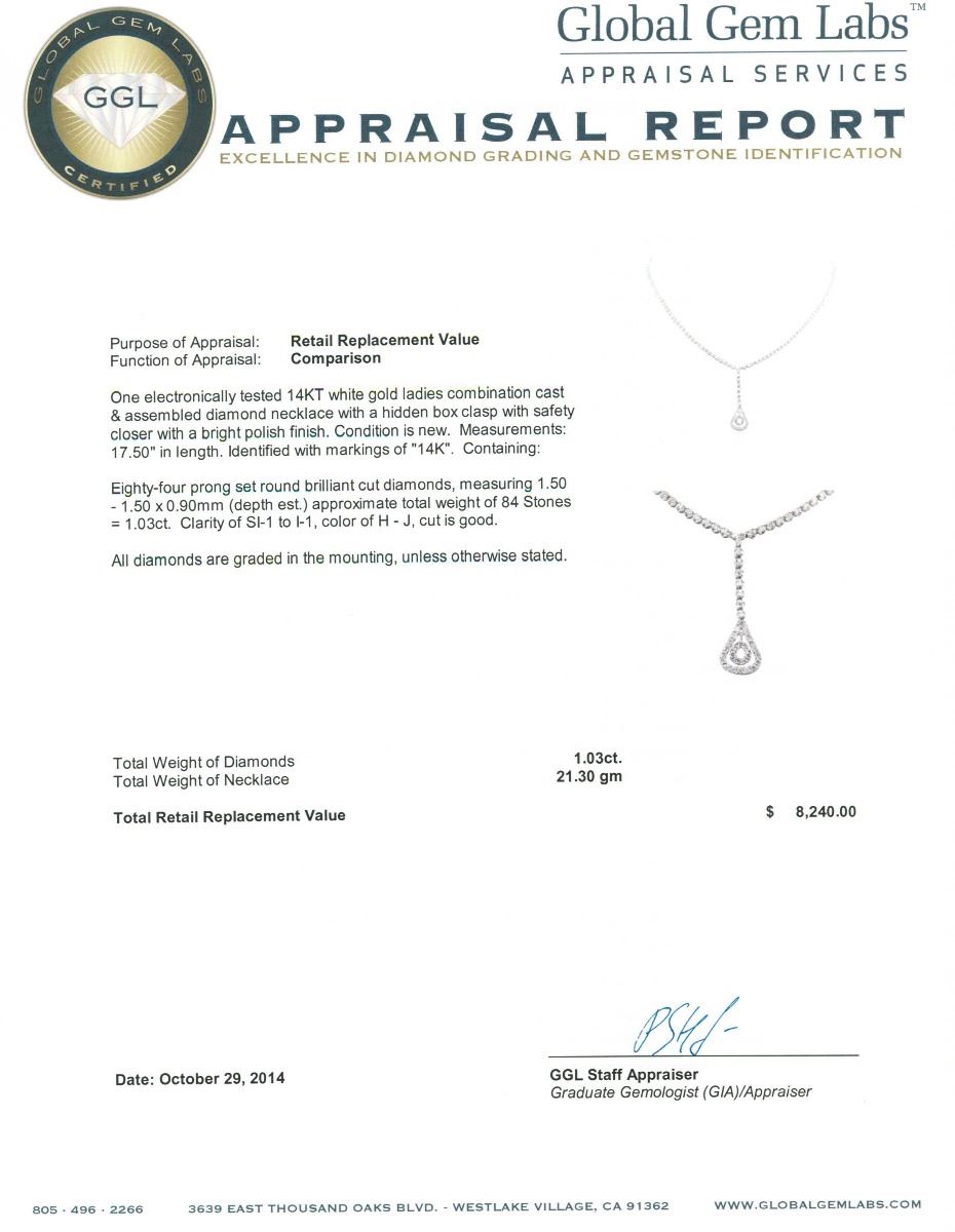 One electronically tested 14KT white gold ladies combination cast & assembled diamond necklace with a hidden box clasp with safety closer with a bright polish finish. Measurements: 17.50 in length. Identified with markings of 14K. Condition is new. Containing: Eighty-Four prong set round brilliant cut diamonds, measuring 1.50 - 1.50 x 0.90mm (depth est.) approximate total weight of 84 Stones = 1.03ct. Clarity: SI-1 to I-1. Color: H - J, Cut is Good. All diamonds are graded in the mounting, unless otherwise stated. Total Weight of Diamonds 1.03ct. Total Weight of Necklace 21.30 grams. GGL Appraised at $8,240.00.