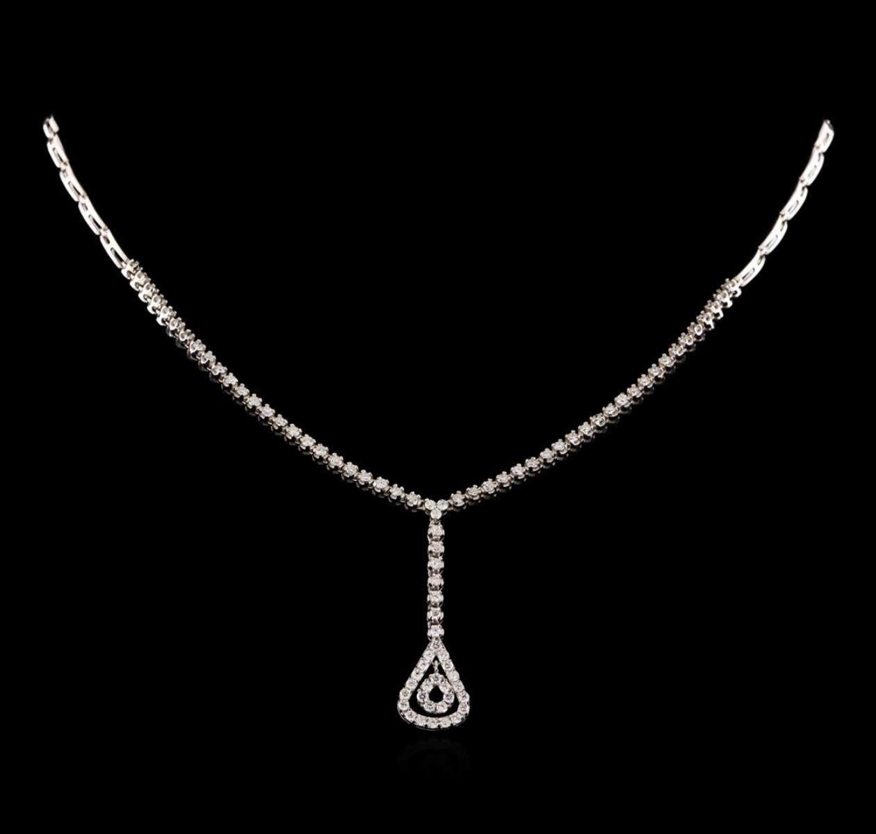 One electronically tested 14KT white gold ladies combination cast & assembled diamond necklace with a hidden box clasp with safety closer with a bright polish finish. Measurements: 17.50 in length. Identified with markings of 14K. Condition is new. Containing: Eighty-Four prong set round brilliant cut diamonds, measuring 1.50 - 1.50 x 0.90mm (depth est.) approximate total weight of 84 Stones = 1.03ct. Clarity: SI-1 to I-1. Color: H - J, Cut is Good. All diamonds are graded in the mounting, unless otherwise stated. Total Weight of Diamonds 1.03ct. Total Weight of Necklace 21.30 grams. GGL Appraised.
