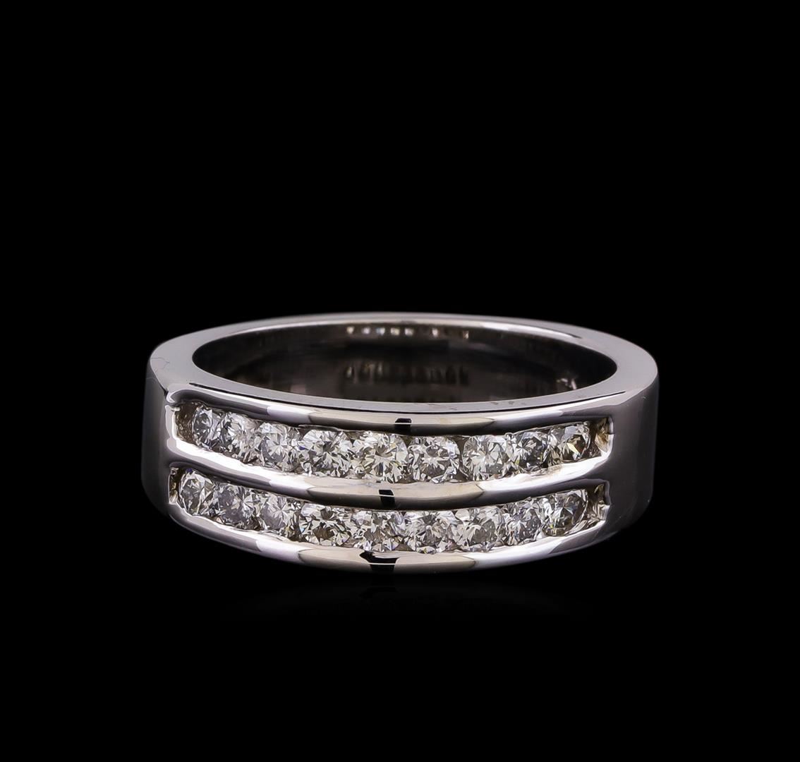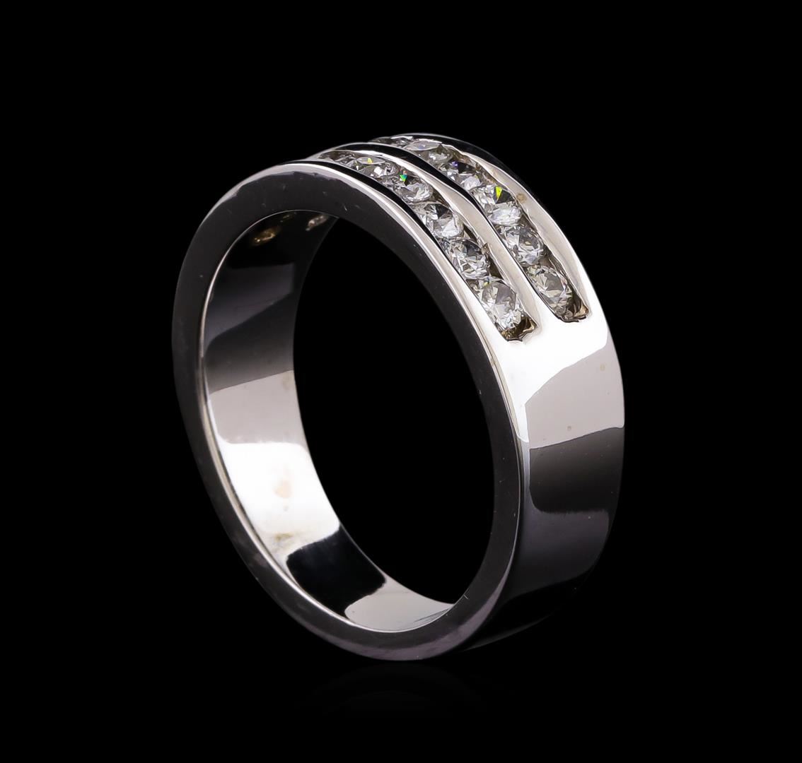 One electronically tested 14KT white gold mens combination cast & assembled diamond ring with a bright polish finish. Identified with markings of "14K". Condition is new. Containing: Eighteen channel set round brilliant cut diamonds, measuring 2.50 - 2.50 x 1.50mm (depth est.) approximate total weight of 18 Stones = 1.03ct. Clarity: SI-2 to I-1. Color: I - J, Cut is Good. All diamonds are graded in the mounting, unless otherwise stated. Total Weight of Diamonds 1.03ct. Total Weight of Ring 10.40 grams. GGL Appraised at $4,610.00.