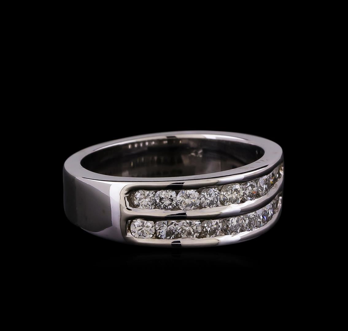 One electronically tested 14KT white gold mens combination cast & assembled diamond ring with a bright polish finish. Identified with markings of "14K". Condition is new. Containing: Eighteen channel set round brilliant cut diamonds, measuring 2.50 - 2.50 x 1.50mm (depth est.) approximate total weight of 18 Stones = 1.03ct. Clarity: SI-2 to I-1. Color: I - J, Cut is Good. All diamonds are graded in the mounting, unless otherwise stated. Total Weight of Diamonds 1.03ct. Total Weight of Ring 10.40 grams. GGL Appraised at $4,610.00.