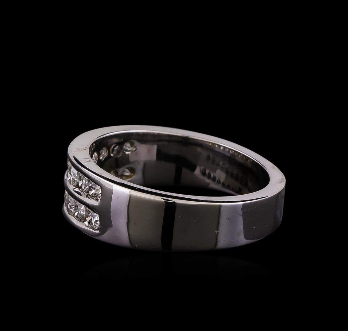 One electronically tested 14KT white gold mens combination cast & assembled diamond ring with a bright polish finish. Identified with markings of "14K". Condition is new. Containing: Eighteen channel set round brilliant cut diamonds, measuring 2.50 - 2.50 x 1.50mm (depth est.) approximate total weight of 18 Stones = 1.03ct. Clarity: SI-2 to I-1. Color: I - J, Cut is Good. All diamonds are graded in the mounting, unless otherwise stated. Total Weight of Diamonds 1.03ct. Total Weight of Ring 10.40 grams. GGL Appraised.
