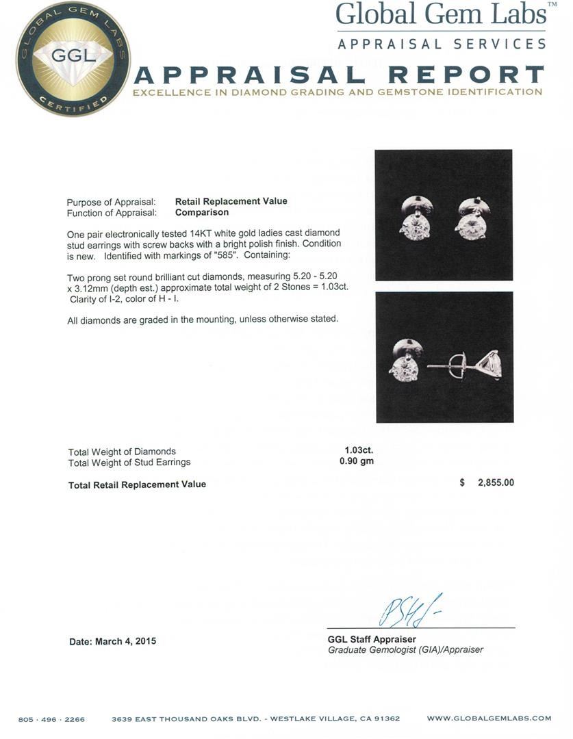 One pair electronically tested 14KT white gold ladies cast diamond stud earrings with screw backs with a bright polish finish. Identified with markings of "585". Condition is new. Containing: Two prong set round brilliant cut diamonds, measuring 5.20 - 5.20 x 3.12mm (depth est.) approximate total weight of 2 Stones = 1.03ct. Clarity: I-2. Color: H - I. All diamonds are graded in the mounting, unless otherwise stated. Total Weight of Diamonds 1.03ct. Total Weight of Stud Earrings 0.90 grams. GGL Appraised at $2,855.00.