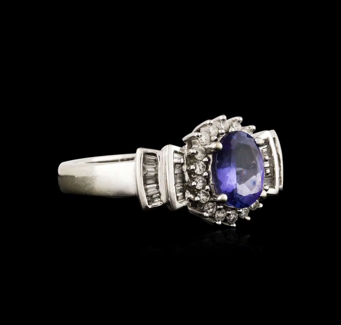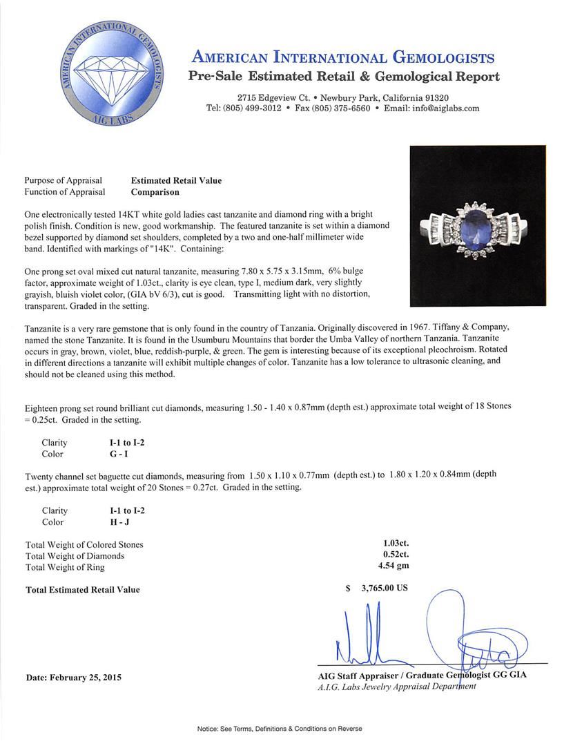 One electronically tested 14KT white gold ladies cast tanzanite and diamond ring with a bright polish finish. The featured tanzanite is set within a diamond bezel supported by diamond set shoulders, completed by a two and one-half millimeter wide band. Identified with markings of "14K". Condition is new, good workmanship. Containing: One prong set oval mixed cut natural tanzanite, measuring 7.80 x 5.75 x 3.15mm, 6%. bulge factor, approximate weight of 1.03ct., clarity is eye clean, type I, medium dark, very slightly grayish, bluish violet color, (GIA bV 6/3), cut is good. Transmitting light with no distortion, transparent. Graded in the setting. Tanzanite is a very rare gemstone that is only found in the country of Tanzania. Originally discovered in 1967. Tiffany & Company, named the stone Tanzanite. It is found in the Usumburu Mountains that border the Umba Valley of northern Tanzania. Tanzanite occurs in gray, brown, violet, blue, reddish-purple, & green. The gem is interesting because of its exceptional pleochroism. Rotated in different directions a tanzanite will exhibit multiple changes of color. Tanzanite has a low tolerance to ultrasonic cleaning, and should not be cleaned using this method. Eighteen prong set round brilliant cut diamonds, measuring 1.50 - 1.40 x 0.87mm (depth est.) approximate total weight of 18 Stones = 0.25ct. Graded in the setting. Clarity: I-1 to I-2. Color: G - I Twenty channel set baguette cut diamonds, measuring from 1.50 x 1.10 x 0.77mm (depth est.) to 1.80 x 1.20 x 0.84mm (depth est.) approximate total weight of 20 Stones = 0.27ct. Graded in the setting. Clarity: I-1 to I-2. Color: H - J. Total Weight of Colored Stones 1.03ct. Total Weight of Diamonds 0.52ct. Total Weight of Ring 4.54 grams. AIG Appraised.
