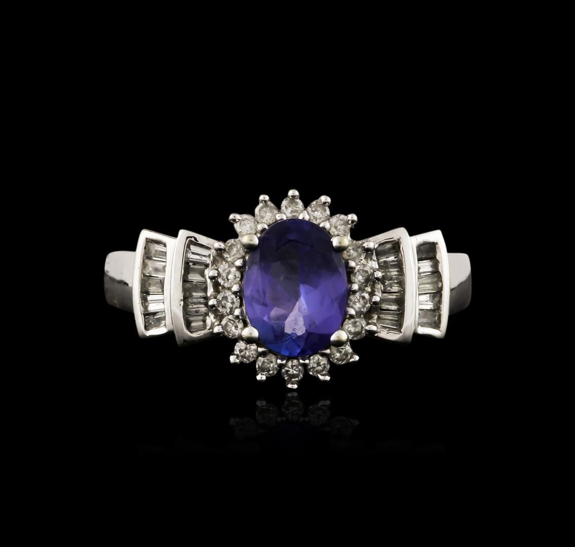 One electronically tested 14KT white gold ladies cast tanzanite and diamond ring with a bright polish finish. The featured tanzanite is set within a diamond bezel supported by diamond set shoulders, completed by a two and one-half millimeter wide band. Identified with markings of "14K". Condition is new, good workmanship. Containing: One prong set oval mixed cut natural tanzanite, measuring 7.80 x 5.75 x 3.15mm, 6%. bulge factor, approximate weight of 1.03ct., clarity is eye clean, type I, medium dark, very slightly grayish, bluish violet color, (GIA bV 6/3), cut is good. Transmitting light with no distortion, transparent. Graded in the setting. Tanzanite is a very rare gemstone that is only found in the country of Tanzania. Originally discovered in 1967. Tiffany & Company, named the stone Tanzanite. It is found in the Usumburu Mountains that border the Umba Valley of northern Tanzania. Tanzanite occurs in gray, brown, violet, blue, reddish-purple, & green. The gem is interesting because of its exceptional pleochroism. Rotated in different directions a tanzanite will exhibit multiple changes of color. Tanzanite has a low tolerance to ultrasonic cleaning, and should not be cleaned using this method. Eighteen prong set round brilliant cut diamonds, measuring 1.50 - 1.40 x 0.87mm (depth est.) approximate total weight of 18 Stones = 0.25ct. Graded in the setting. Clarity: I-1 to I-2. Color: G - I Twenty channel set baguette cut diamonds, measuring from 1.50 x 1.10 x 0.77mm (depth est.) to 1.80 x 1.20 x 0.84mm (depth est.) approximate total weight of 20 Stones = 0.27ct. Graded in the setting. Clarity: I-1 to I-2. Color: H - J. Total Weight of Colored Stones 1.03ct. Total Weight of Diamonds 0.52ct. Total Weight of Ring 4.54 grams. AIG Appraised.