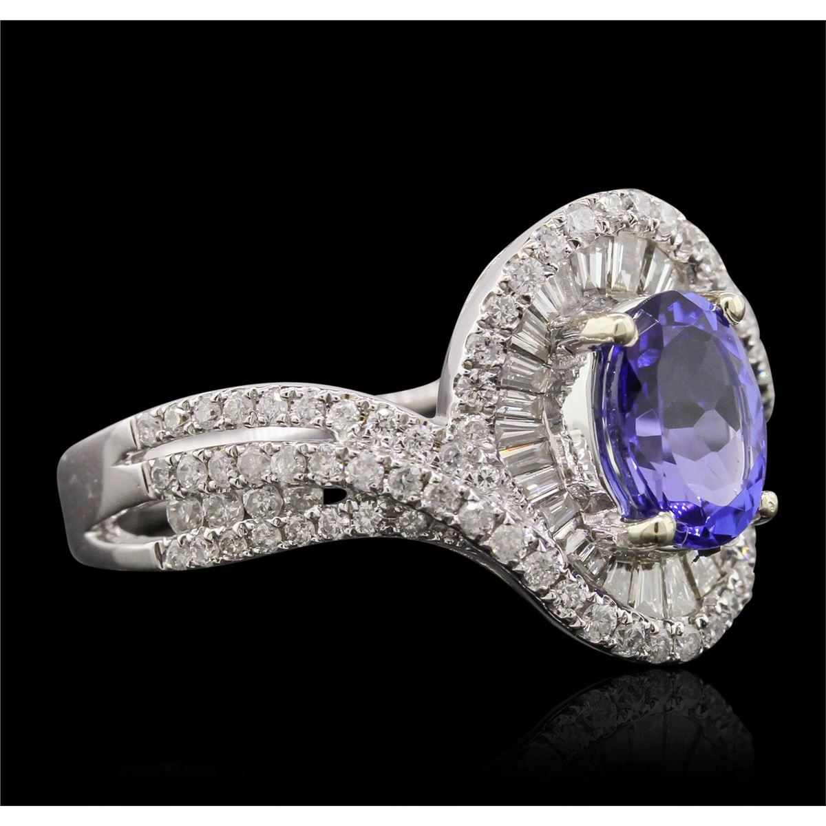 One electronically tested 14KT white gold Ladies combination cast & assembled ring with a bright polish finish. Condition is new. Identified with markings of "14K". Containing: One prong set oval modified brilliant cut natural tanzanite, measuring 7.60 x 5.50 x 3.58mm, approximate weight of 1.03ct., clarity is eye clean, type I, medium, moderately strong, bluish violet color, (GIA bV 5/4), cut is very good. Colored gemstones are presumed to have been subjected to commonly used color/clarity enhancement processes. Ninety-Four bead set round brilliant cut diamonds, measuring 1.10 - 1.10 x 0.66mm (depth est.) approximate. Total Weight of 94 Stones = 0.45ct. Clarity: I-1 to I-2. Color: H - I, Cut is Good. Twenty-Eight channel set baguette cut diamonds, measuring 1.30 x 1.00 x 0.85mm (depth est.) approximate. Total Weight of 28 Stones = 0.28ct. Clarity: SI-1 to SI-2. Color: H - I, Cut is Good. Total Weight of Colored Stones 1.03ct. Total Weight of Diamonds 0.73ct. Total Weight of Ring 5.00 grams. GGL Appraised at $4,895.00.