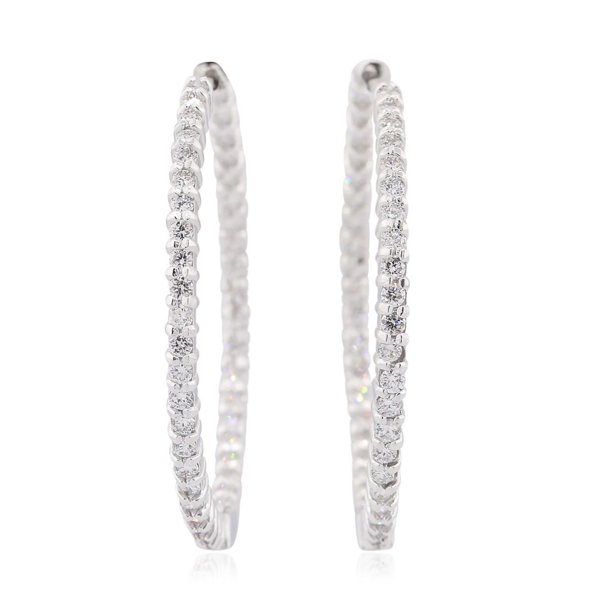 One pair electronically tested 14KT white gold ladies combination cast & assembled diamond hoop earrings with a bright polish finish. Identified with markings of "14K". Condition is new. Containing: Eighty-Four prong set round brilliant cut diamonds, measuring 1.50 - 1.50 x 0.90mm (depth est.) approximate total weight of 84 Stones = 1.03ct. Clarity: SI-1 to I-1. Color: I - J, Cut is Good. All diamonds are graded in the mounting, unless otherwise stated. Total Weight of Diamonds 1.03ct. Total Weight of Earrings 11.50 grams. GGL Appraised at $6,125.00.